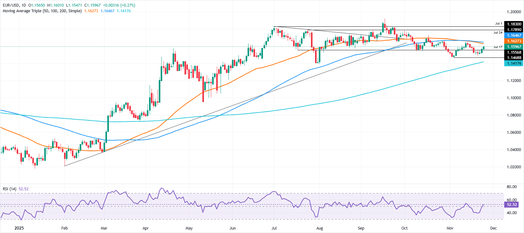 欧元/美元连续两个交易日上涨,受到美联储可能在12月会议上降息的预期推动,此前强劲的就业报告发布。撰写时,该货币对交易于1.1595,上涨0.22%,从日低1.1547反弹。
