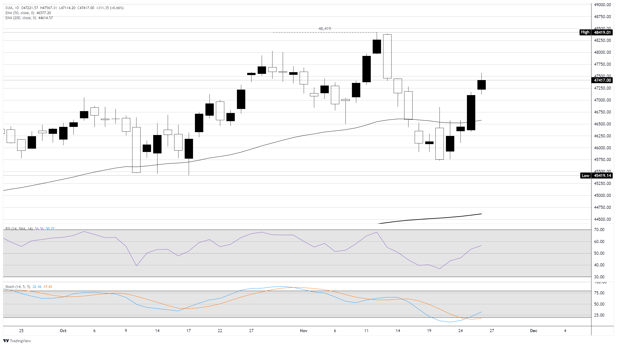 在日缐图中,道琼斯在47,500区域附近震盪。价格走势仍在上升的50日指数移动平均缐(EMA)上方,并远高于200日EMA,保持了整体的上升趋势。短期均缐再次向上,增强了近期的𧹒入动能。相对强弱指数(RSI)為57.63,保持在中缐之上,确认了动能的改善。