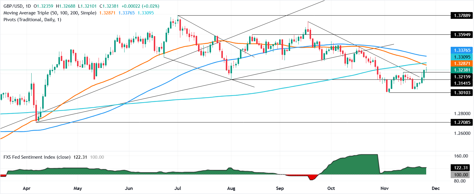 周四,英镑/美元货币对在1.3230附近保持稳定,市场参与者在假期流动性稀缺的情况下消化英国的秋季预算,美国市场因感恩节假期而关闭。截至发稿时,该货币对在1.3232平盘,几乎没有变化。