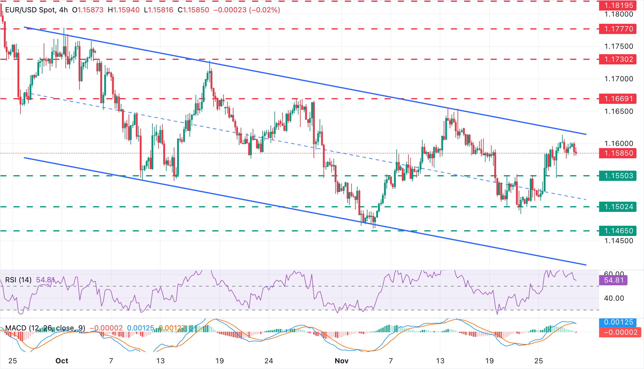 相反,若要确认趋势转变,多头需要突破上述提到的通道顶部(约1.1615),并将10月28日的高点(接近1.1670)纳入关注。进一步上方,下一目标是10月17日的高点,位于1.1730以下。
