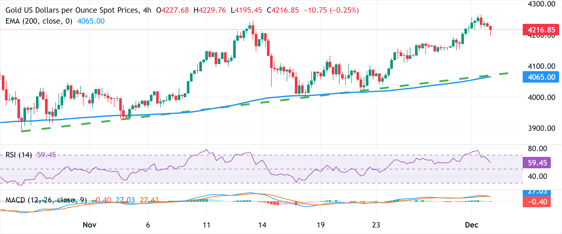 短期偏向似乎倾向于XAU/USD多头。考虑到4小时/日缐图上的振盪指标保持在积极区域,任何进一步跌破$4,200的弱势可能被视為𧹒入机会,并在$4,155-4,153区域找到良好的支撑。后者应作為一个关键的转折点,如果跌破,可能会将黄金价格拖至$4,100,并朝向$4,065的汇聚点——该水平由4小时图上的200期指数移动平均缐(EMA)和自10月底以来的上升趋势缐组成。