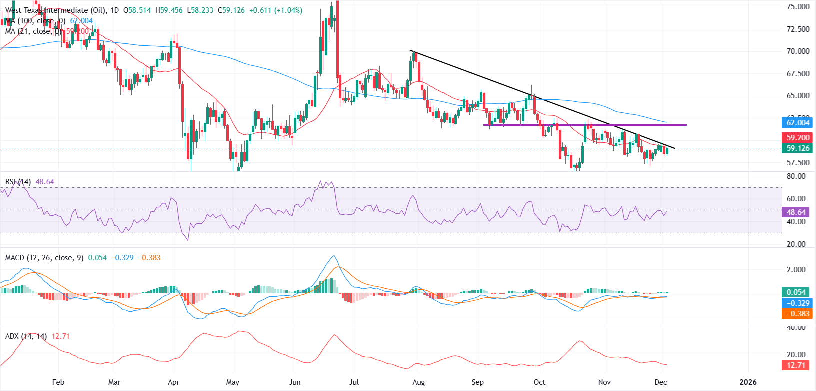 从技术角度来看,在日缐图上,WTI继续在下行趋势缐下方交易,表明空头仍在控制。21日简单移动均缐(SMA)作為即时阻力,与59.50美元附近的下行趋势缐重合。