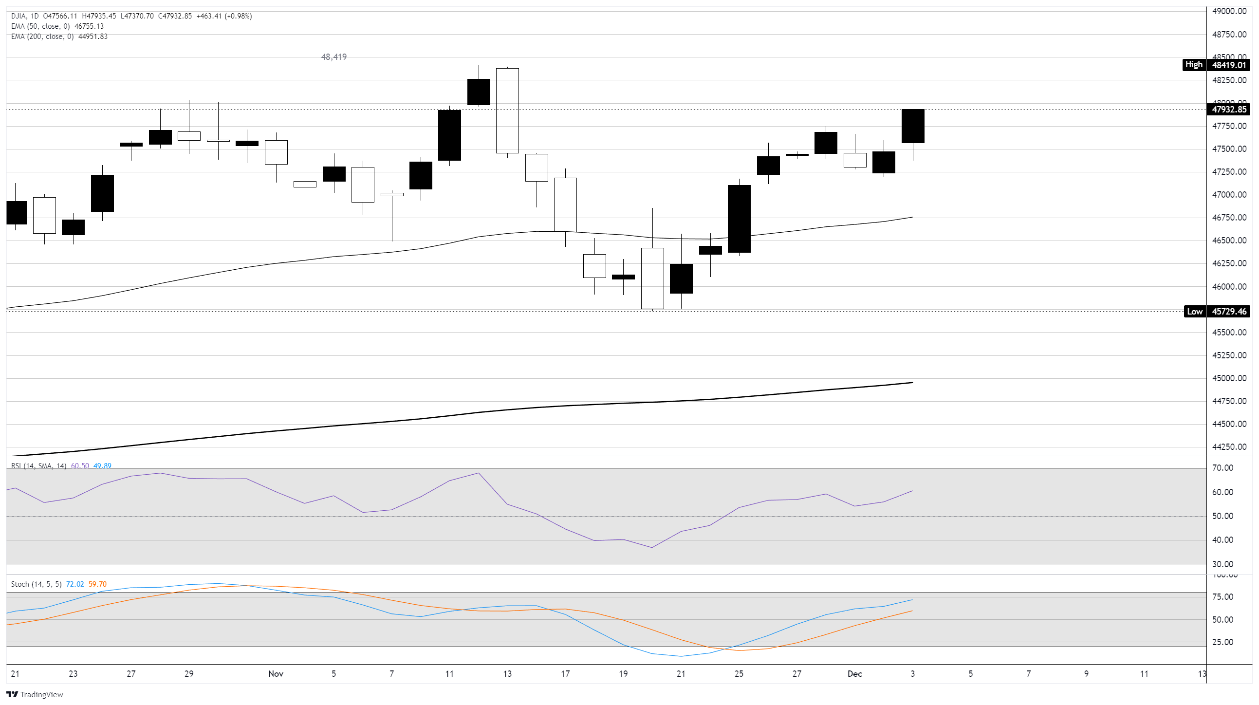道琼斯工业平均指数(DJIA)周三上涨420点,市场对美国经济表现不佳的乐观情绪重新点燃,认為美联储(Fed)将被迫在12月进行第三次连续降息。由于ADP就业数据的急剧收缩以及微软(MSFT)以人工智慧為重点的销售部门的下调修正,股市在当天早些时候出现了看跌倾向,对股市交易者造成了严重打击。然而,面对崩溃的劳动力市场,另一次25个基点的降息的曙光激发了周中市场交易的看涨情绪。