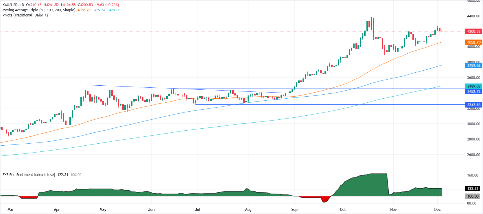 技术分析:黄金徘徊在4200美元附近,等待催化剂