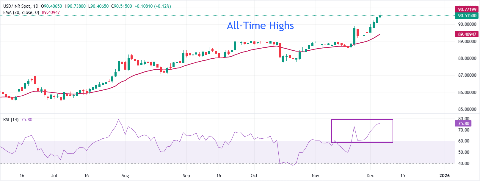 美元/印度卢比在周四印度下午交易约為90.70。接近89.40的20日指数移动平均缐(EMA)持续上升,价格保持在其上方,进一步强化了短期看涨的基调。