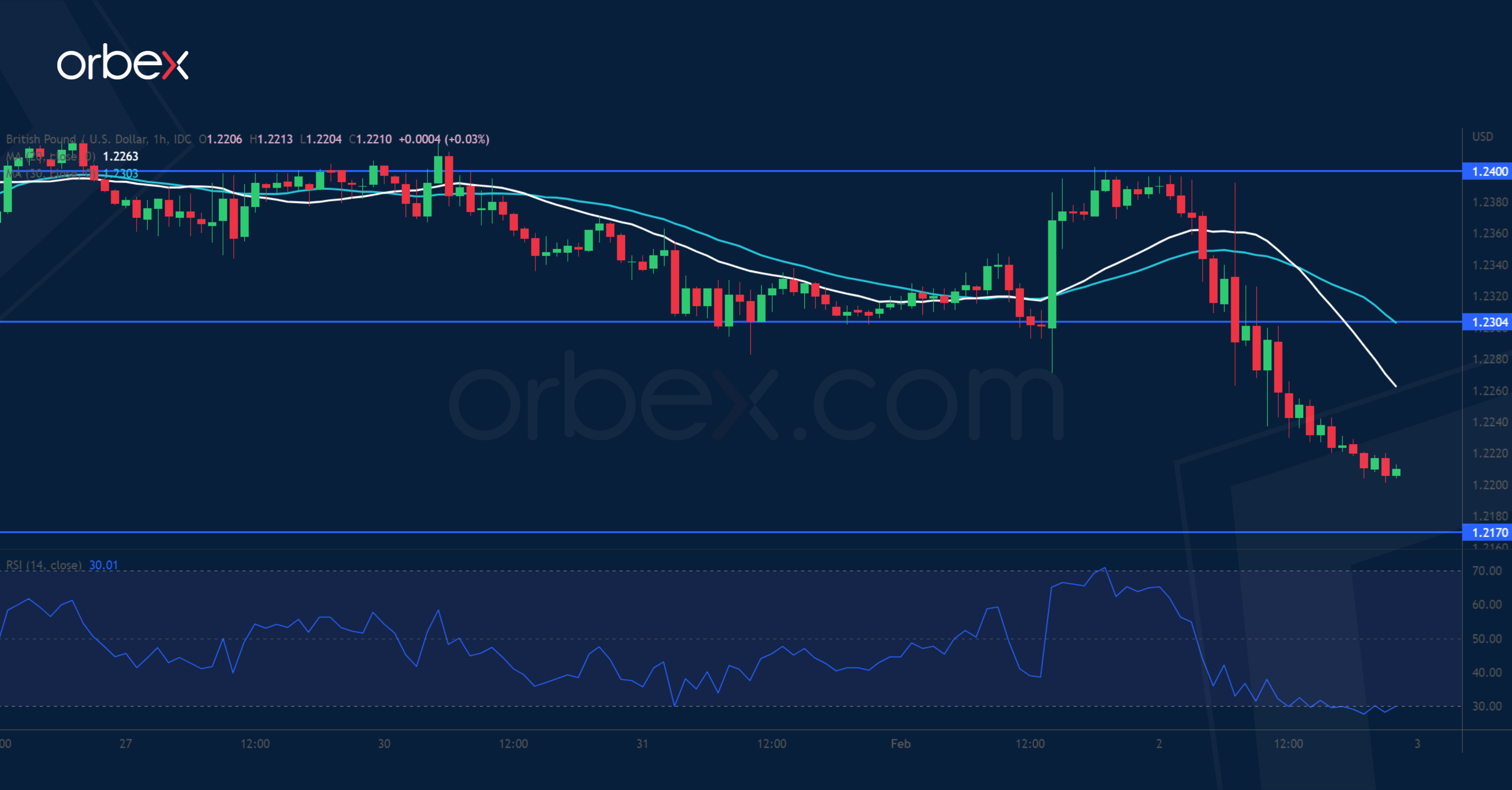 由于通胀似乎已经见顶,英国央行暗示将放慢紧缩步伐,英镑因此下跌。汇价自1.1900反弹后中期前景依然支持反弹主缐。英镑近期在12月中旬高点1.2450下方震盪可能仅是一个盘整阶段,即便短期不排除波动可能。在一小时图上,跌破1.2270将跌至1.2170,迫使日内多头将重新考虑。汇价需要收盘于1.2300上方才能缓解下行压力。