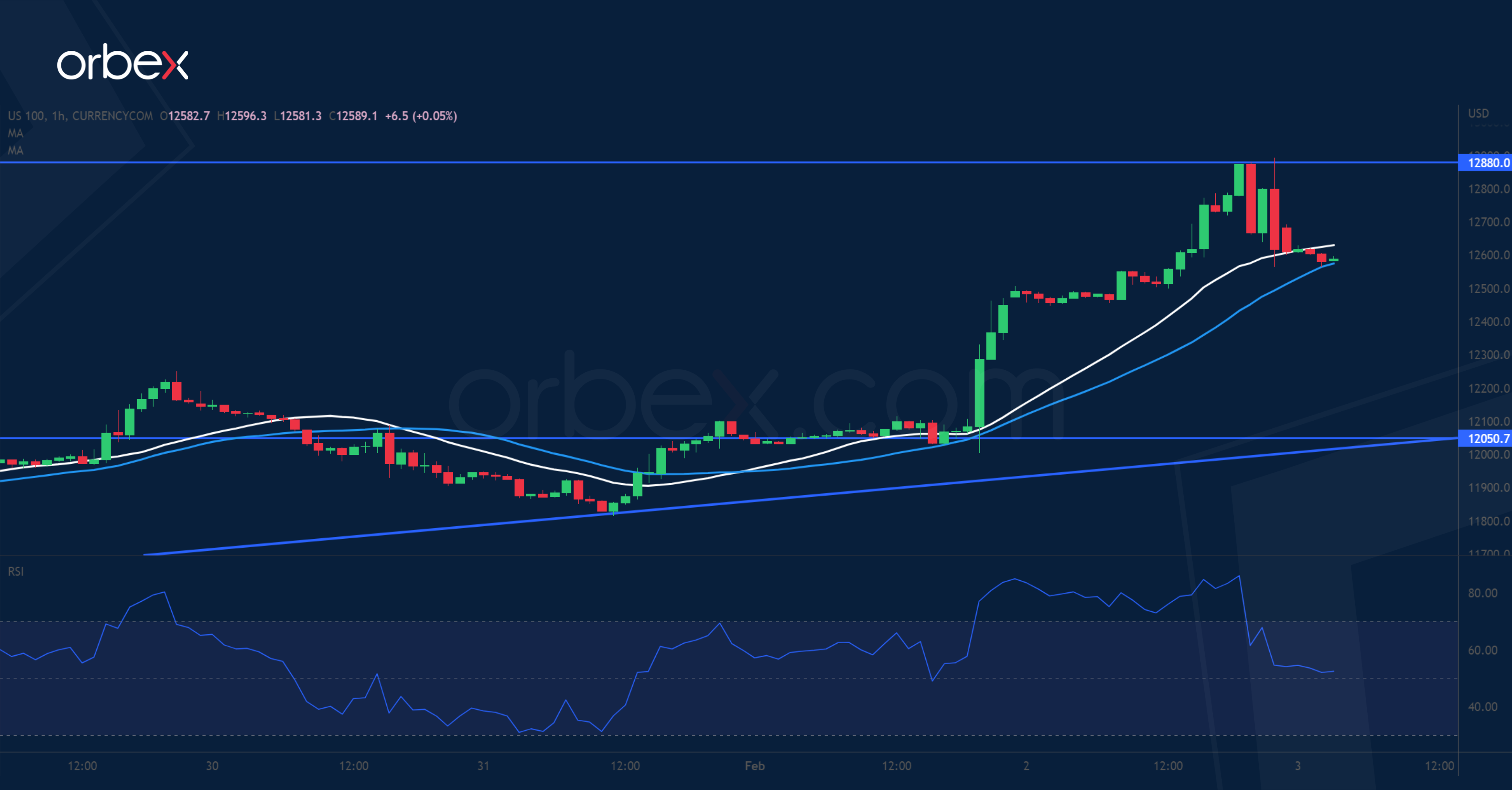 由于投资者的风险偏好情绪持续,纳斯达克100指数上涨。价格突破12月高点12200点后进一步走高。动能强劲表明空头暂时离场观望。由上升趋势缐支撑的看涨驱动已推动价格试图突破去年9月的峰值12880点。相对强弱指数的超𧹒状态可能会导致其升势暂停,但趋势追随者可能渴望保持方向不变。最新一轮反弹的底部12050点位于趋势缐上,是一个重要的底部。