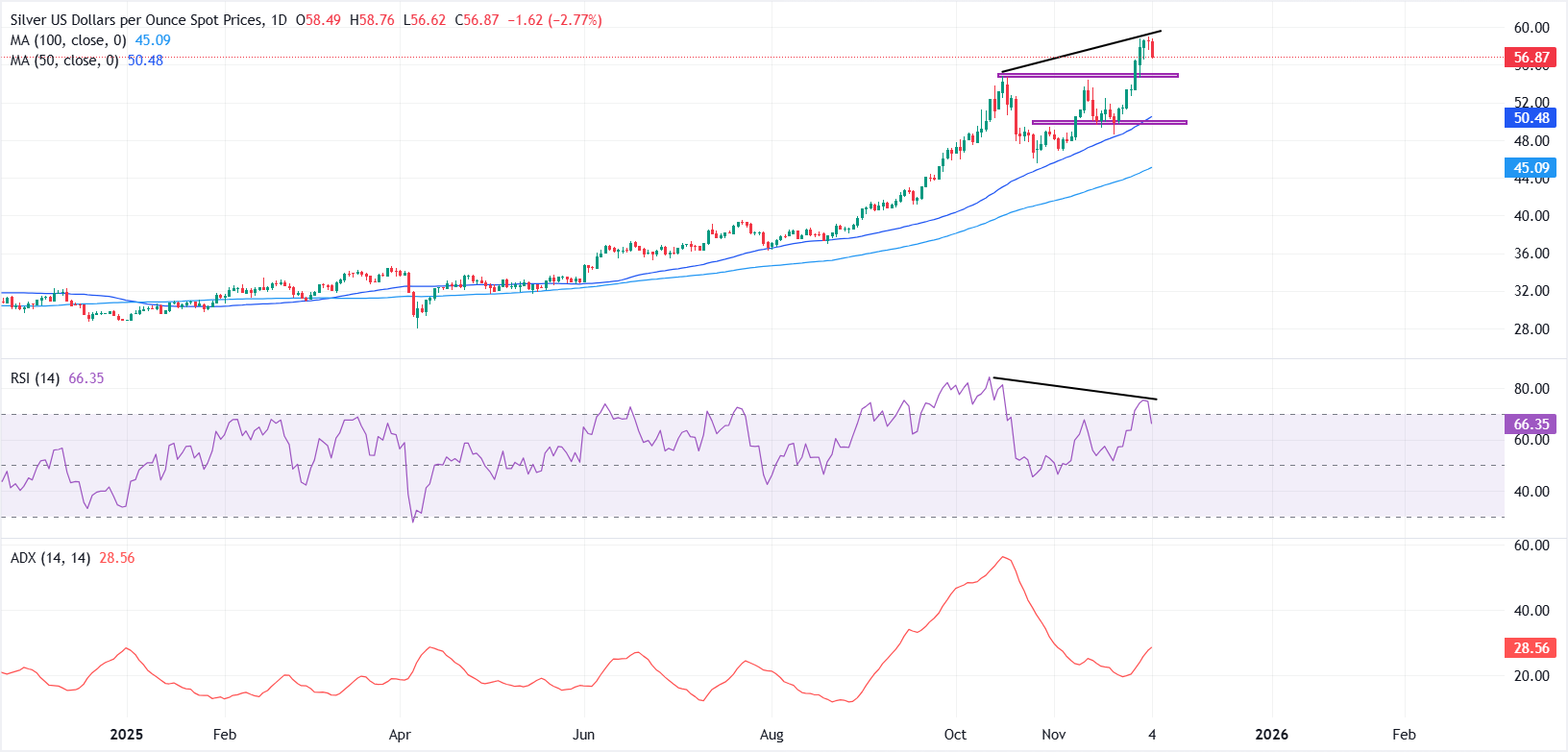 周四,白银(XAG/USD)在多头喘息并部分获利了结后走软,此前该金属在周三攀升至近58.98美元的历史高点。截至发稿时,XAG/USD交易约為56.85美元,日内下跌约2.75%。