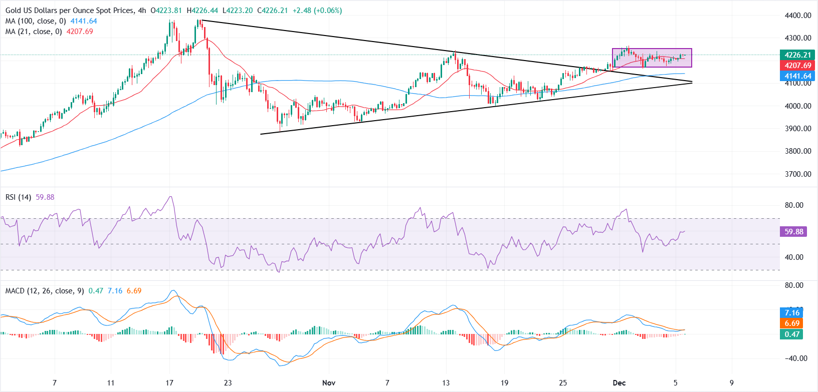 在撰写本文时,黄金/美元交易接近4215美元,鸽派的美联储(Fed)预期继续提供支持,侭管日内回调,但仍帮助限制下行。