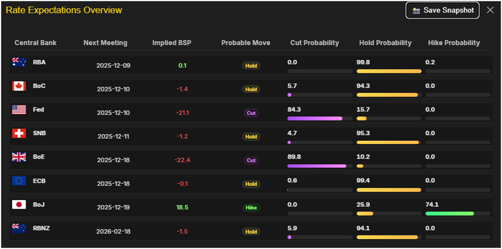 在这种背景下,市场对下周美联储降息25个基点(bps)的预期保持不变,达84%,如Capital Edge利率预期概览数据所示。