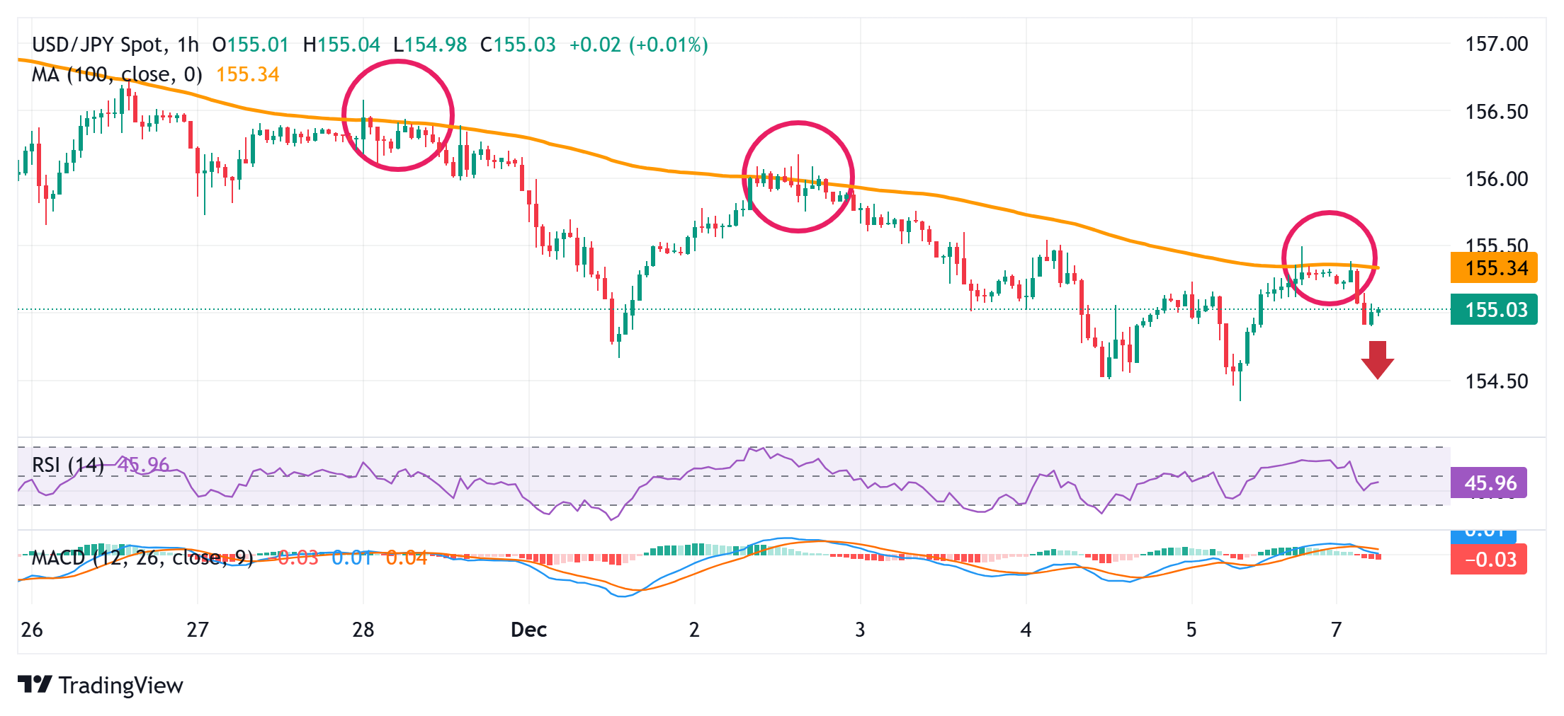 美元/日圆在周五继续难以突破100小时简单移动均缐(SMA),随后的下滑有利于看跌交易者。此外,小时图上的技术指标保持在负区间,支持进一步下跌的观点,侭管日缐图上的中性振盪器需要一些谨慎。因此,任何进一步的日内下滑可能在上周五的低点附近找到支撑,约在154.35区域,低于该水平,现货价格可能跌至154.00整数关口。