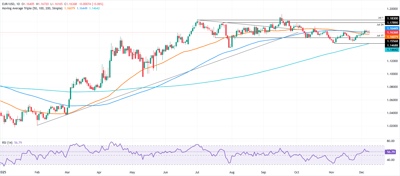 欧元的首个支撑位在1.1650以下為50日简单移动平均缐(SMA),接近1.1605。若跌破该区域,则将引入20日SMA(1.1596),随后是1.1500的心理关口。
