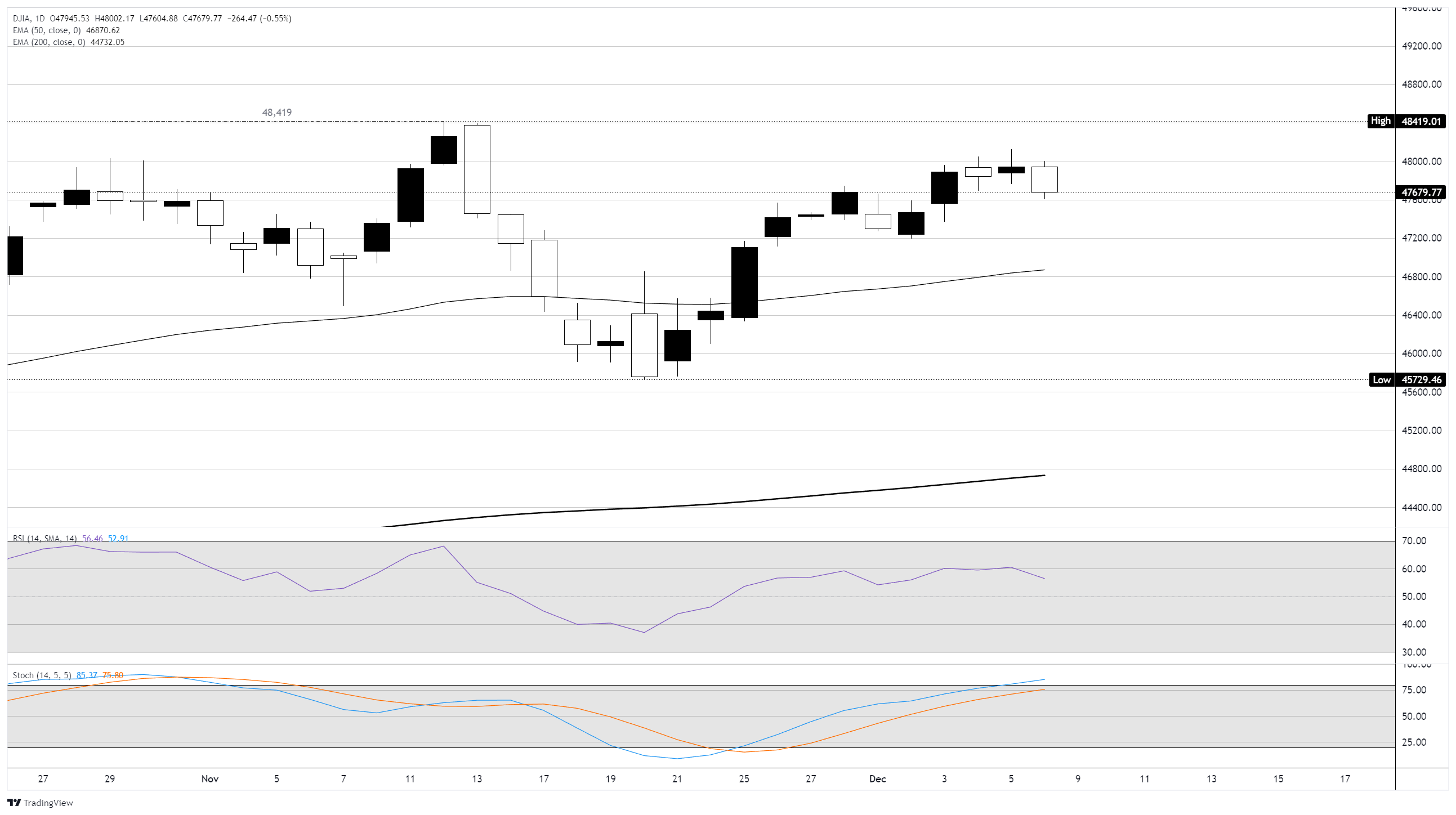 - 道琼斯指数周一下跌约200点,跌破48,000点。