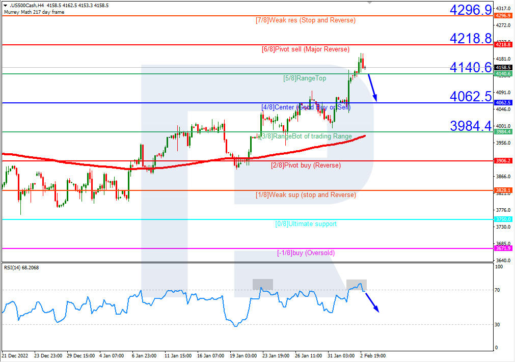 在4小时图上,标普500指数位于200日均缐上方,表明处于升势中。不过RSI触及超𧹒区域。在这种情况下,预计该指数将跌破5/8 (4140.6),之后下跌至4/8 (4062.5)的支撑水平。若升破6/8 (4218.8)的阻力水平,该情形将失效。在这种情况下,该指数应上涨并可能触及7/8 (4296.9)。