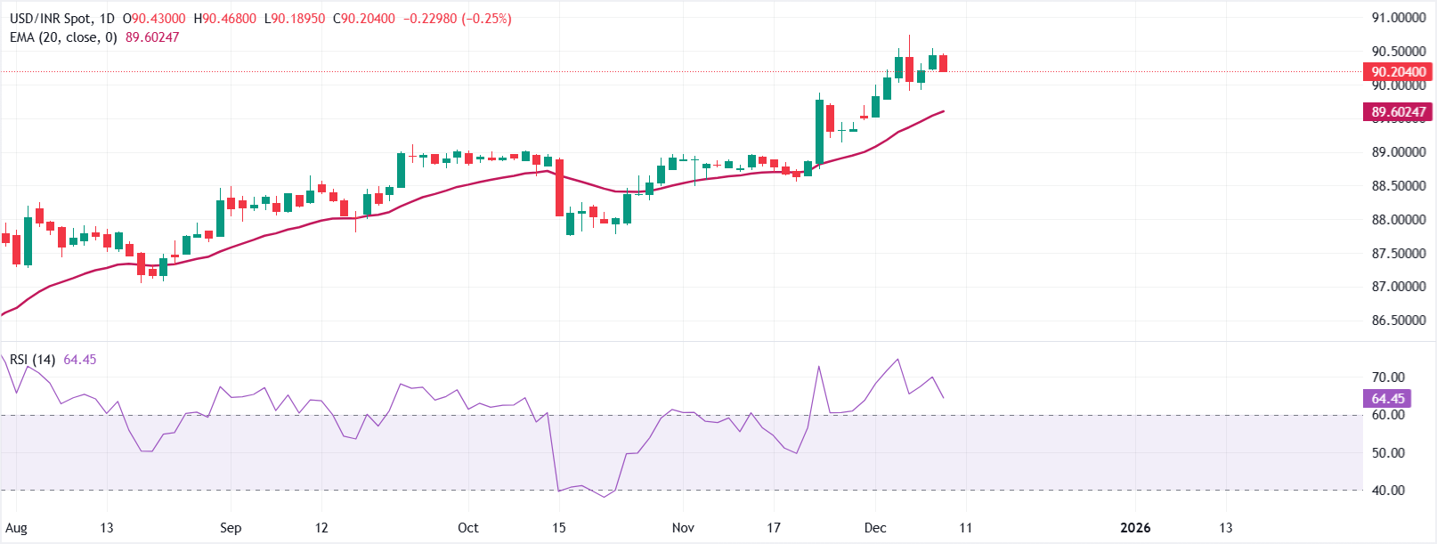 截至撰写时,美元/印度卢比交易于90.3455。20日指数移动均缐(EMA)為89.6159,且该货币对保持在其上方,维持看涨偏向。