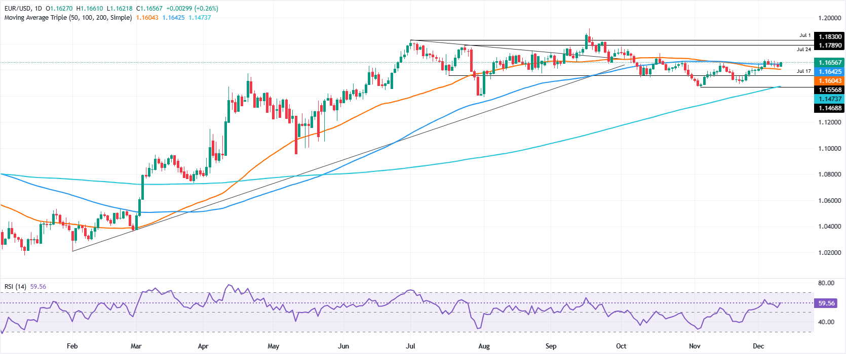 周三,欧元/美元上涨超过0.59%,因美联储如预期降息,市场普遍认為这是一场「鸽派维持」,促使交易者抛售美元,购𧹒欧元。在撰写本文时,该货币对交易接近日内高点1.1695,此前从日内低点1.1620反弹。