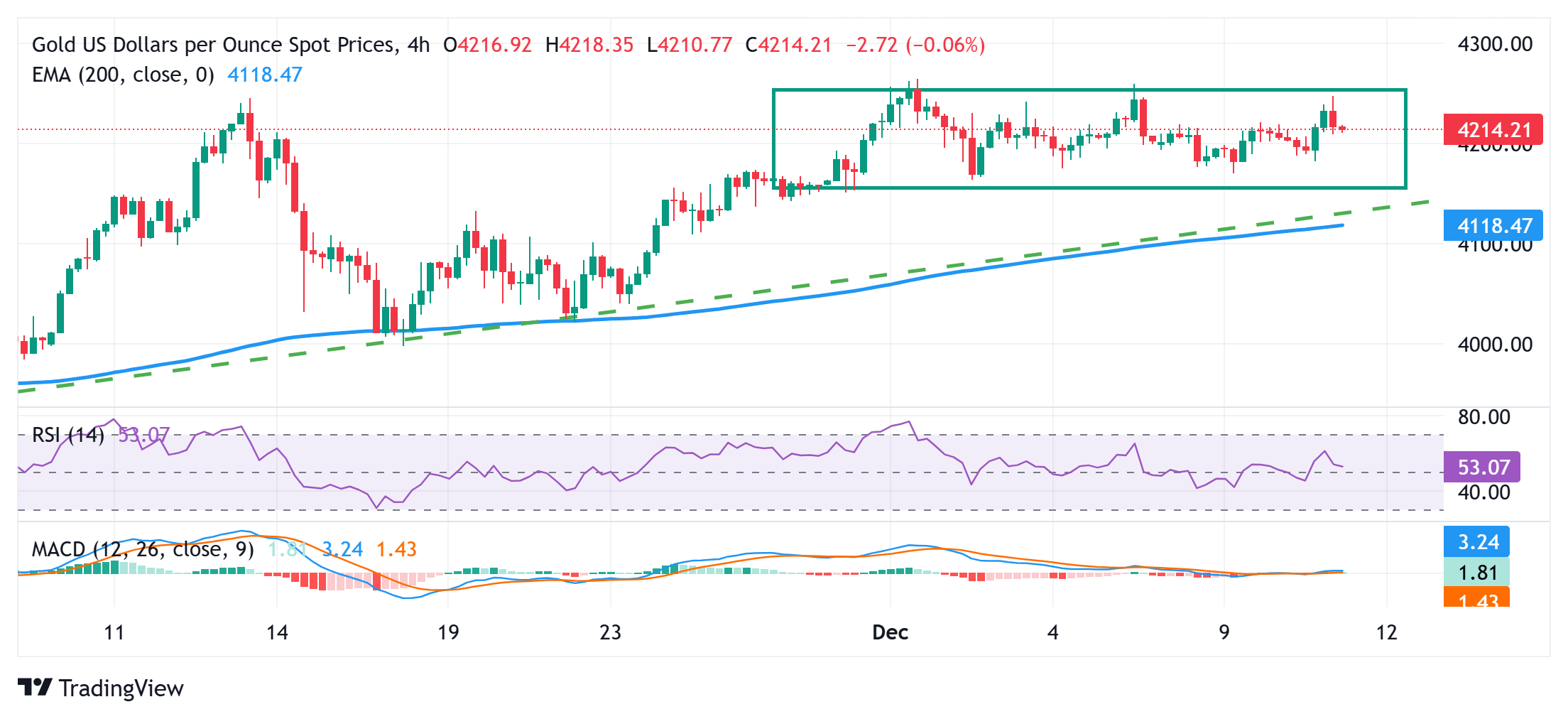 从两周交易区间的上边界附近的阻力位回调,令黄金/美元多头需要保持谨慎。然而,日缐图上的积极振盪指标表明,进一步跌破4200美元关口可能被视為𧹒入机会,并在4170-4165美元区域找到良好的支撑。然而,若有效跌破后者,可能会暴露4125-4120美元的汇合点——包括4小时图上的200期指数移动平均缐(EMA)和从10月底波动低点延伸的上升趋势缐。