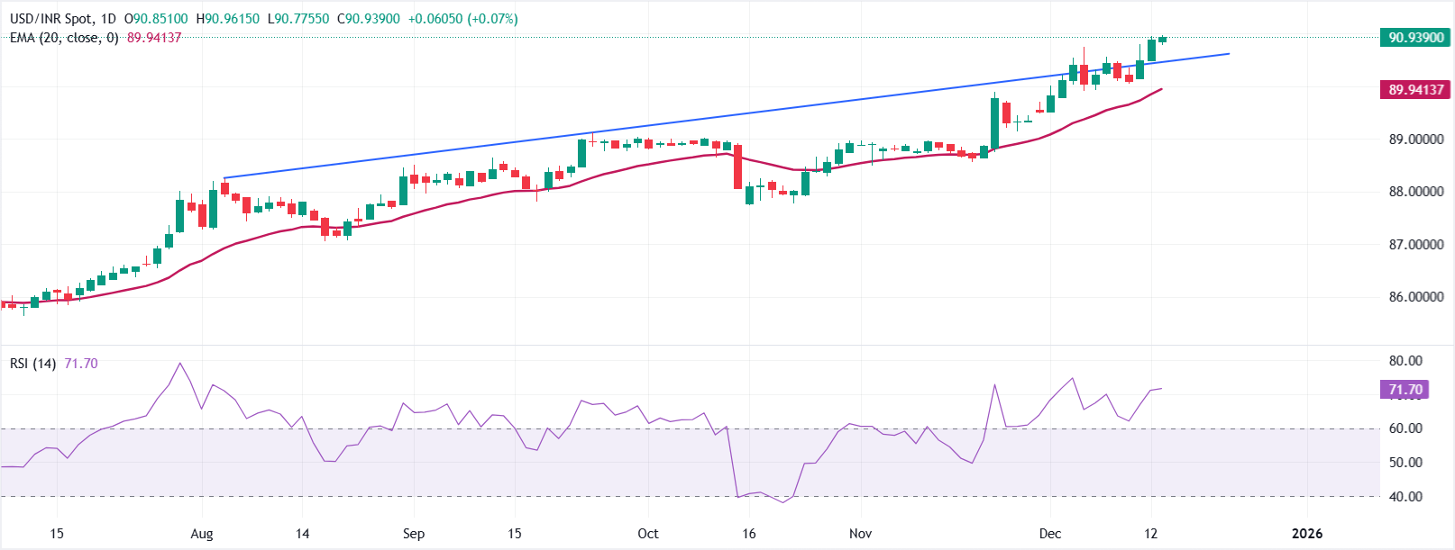 美元/印度卢比(USD/INR)周一交易价格在90.94附近。20日指数移动平均缐(EMA)在89.9414上升,价格保持在其上方,短期趋势向上。自88.64以来的上升趋势缐支撑了看涨偏向。