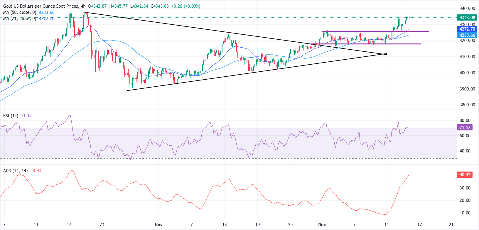 从技术角度来看,黄金的整体结构在突破对称三角形模式后保持积极。上行方面,立即阻力位在4350美元附近,之后可能重新测试历史最高点4381美元。