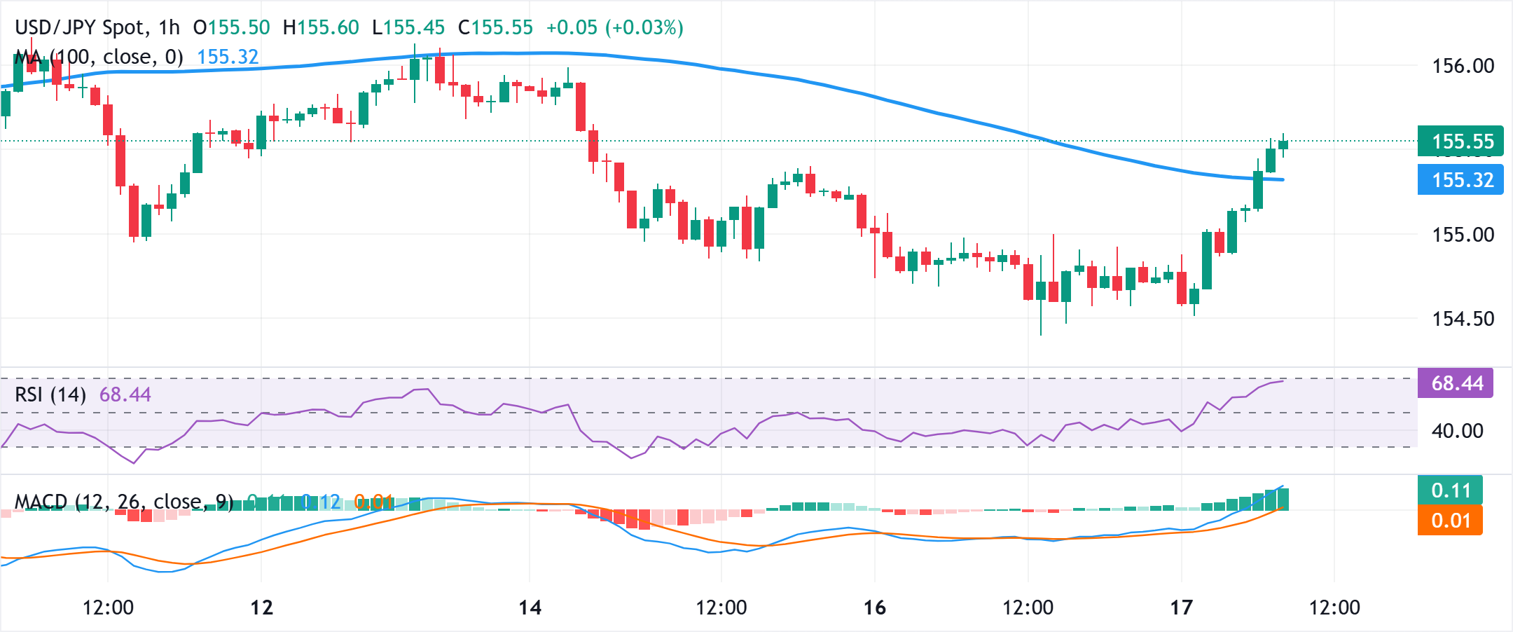 美元/日圆可能瞄准重新收复156.00;日内突破100小时简单移动平均缐进入考虑范围