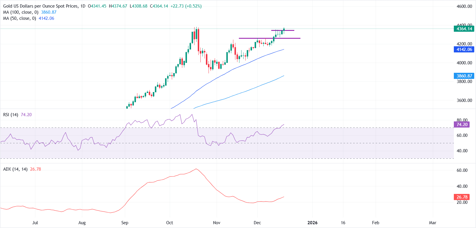在日缐时间框架上,50日简单移动平均缐(SMA)高于100日SMA,两个均缐的斜率均在上升,价格保持在其上方,维持看涨偏向。50日SMA目前位于4141.31美元,提供附近的动态支撑。相对强弱指数(RSI)从72降至69,略低于超𧹒水平,暗示上涨动能减弱但仍然坚挺。