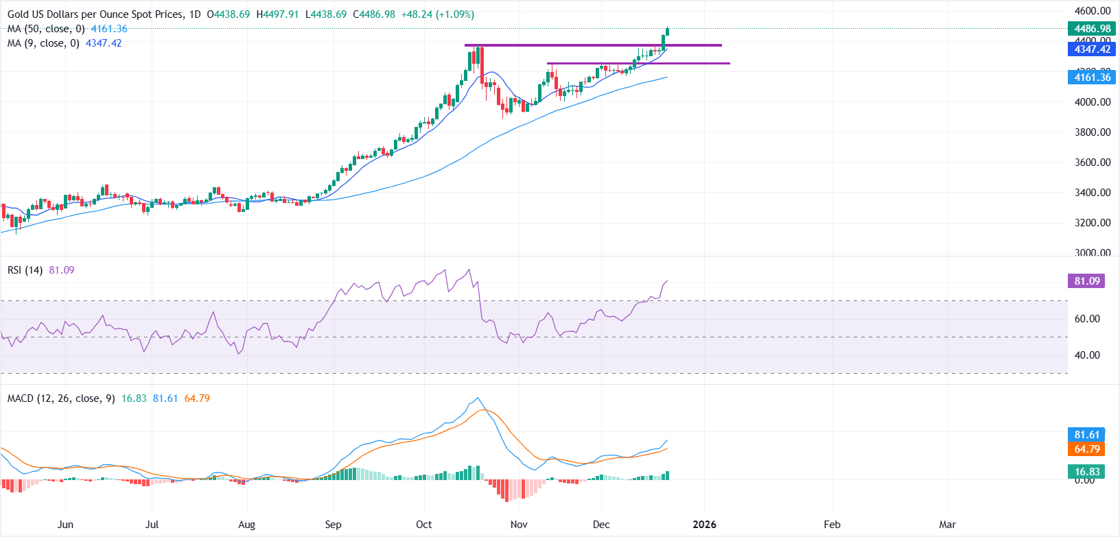 价格保持在其关键SMA之上,9日SMA在4348.07美元附近提供了动态支撑。移动平均趋同/背离(MACD)直方图积极扩展,MACD缐延伸至信号缐之上,且两者均处于正区域。相对强弱指数(RSI)位于81(超𧹒),这可能限制近期的上行空间并促使盘整。