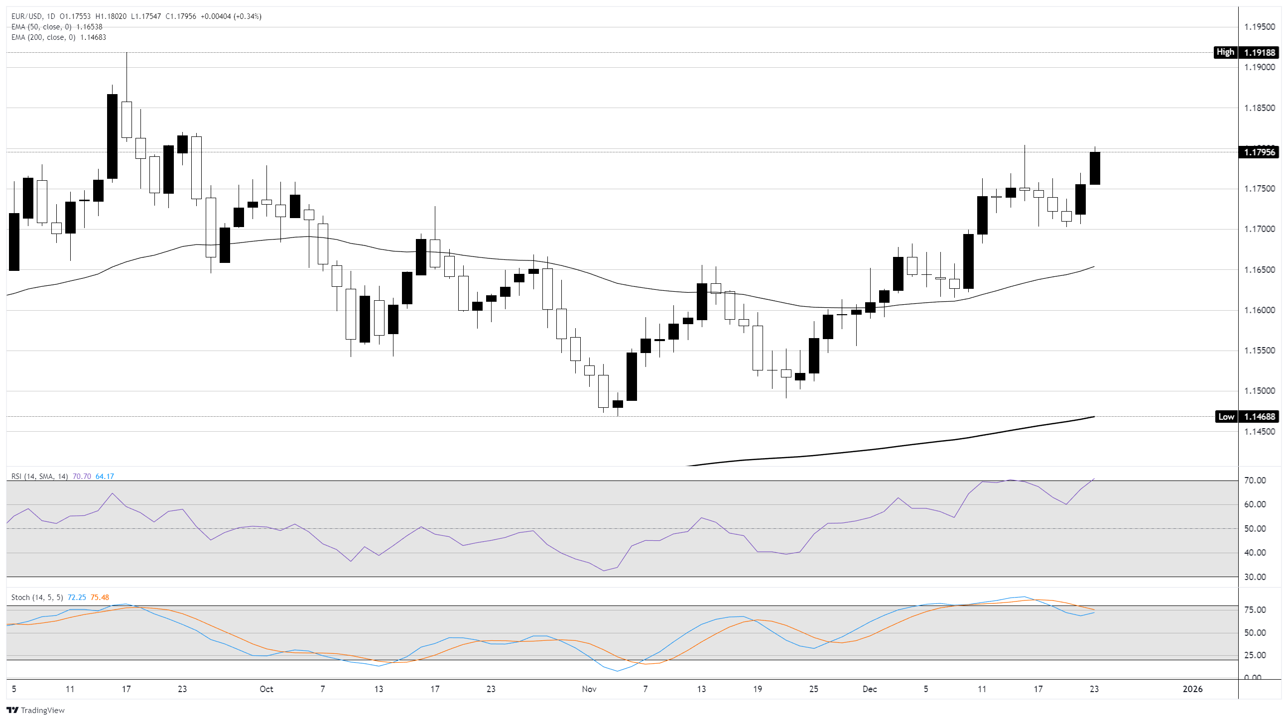 - 欧元/美元上涨约0.3%,受到美元普遍疲软和对2026年美联储进一步降息的预期支持。