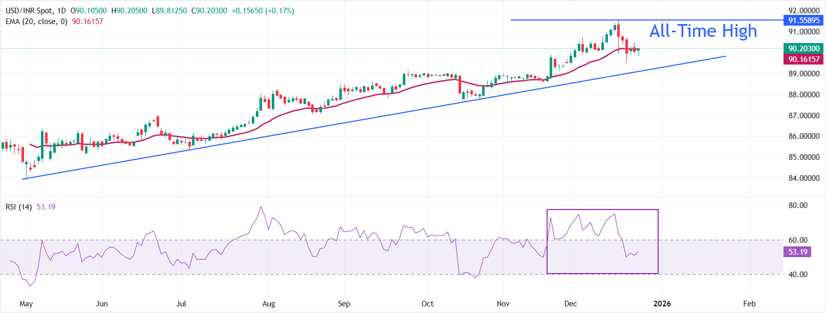 印度卢比(INR)在周三的早盘交易中对美元(USD)小幅下跌。美元/印度卢比(USD/INR)对接近90.16,但总体处于修正阶段,此前印度央行(RBI)在上周进行了干预。