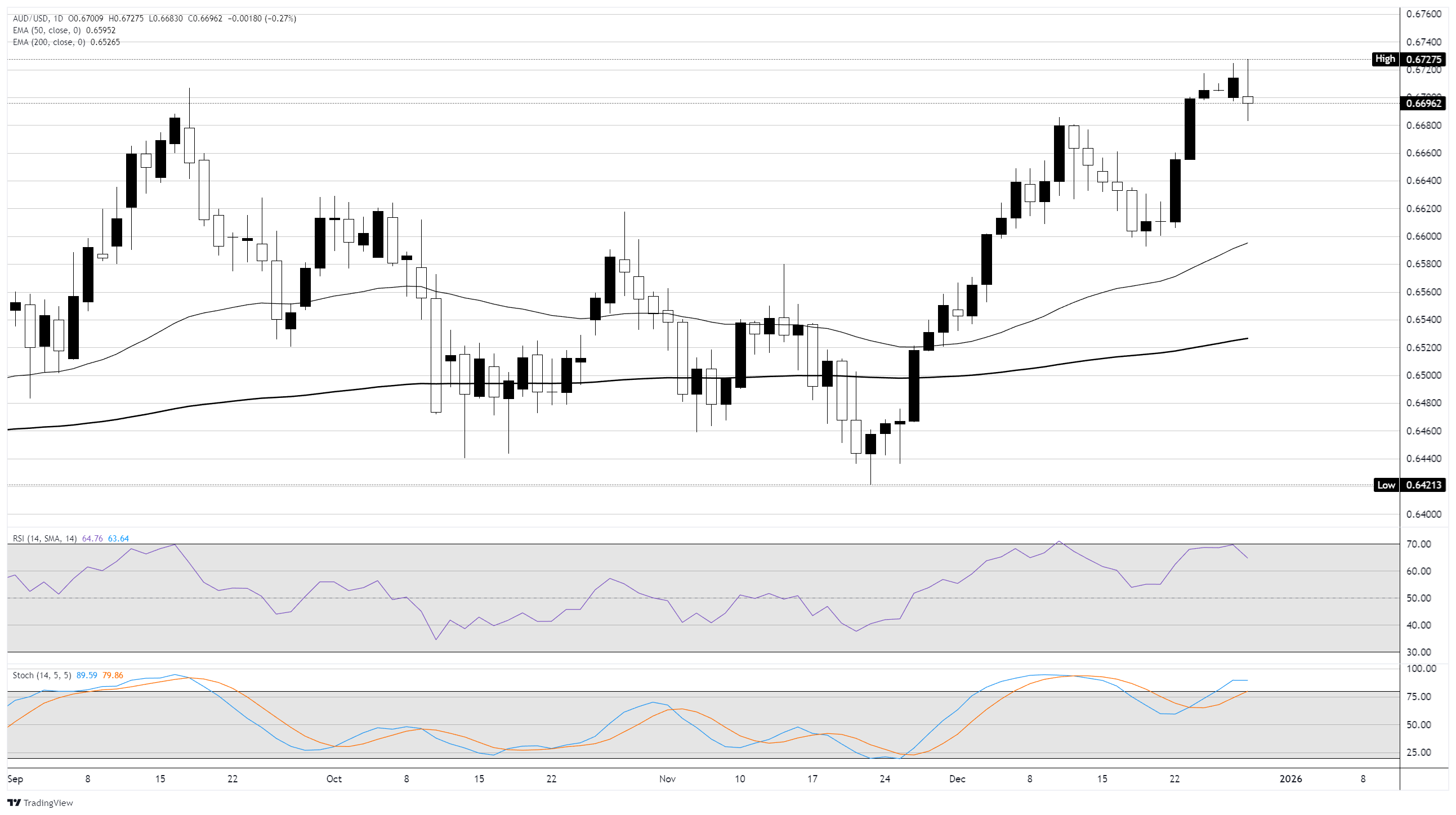 澳元/美元在2025年最后一个交易周𫔭盘时熄火,制动了近期的看涨走势,回落至0.6700以下,因為交易者在年末放缓期间重新采取防禦性头寸。