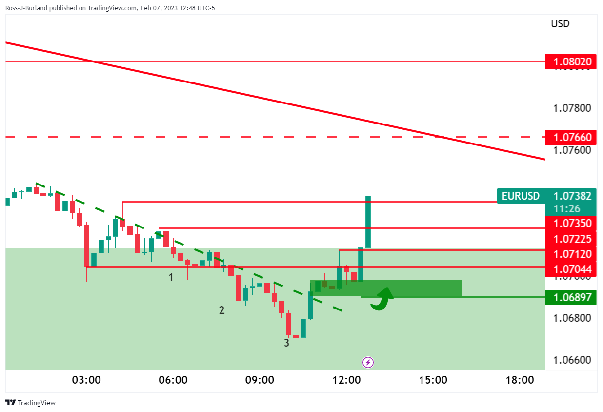 美元正出现下跌,欧元/美元已经反弹,如下所示: