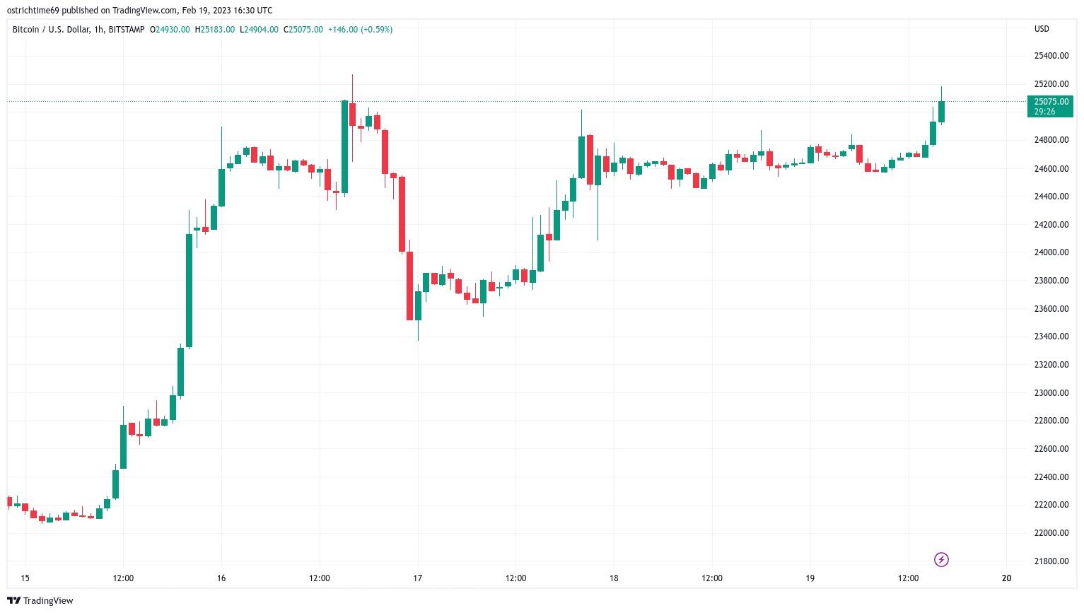 2月19日,随著至关重要的一周收盘临近,比特币第三次触及2.5万美元。