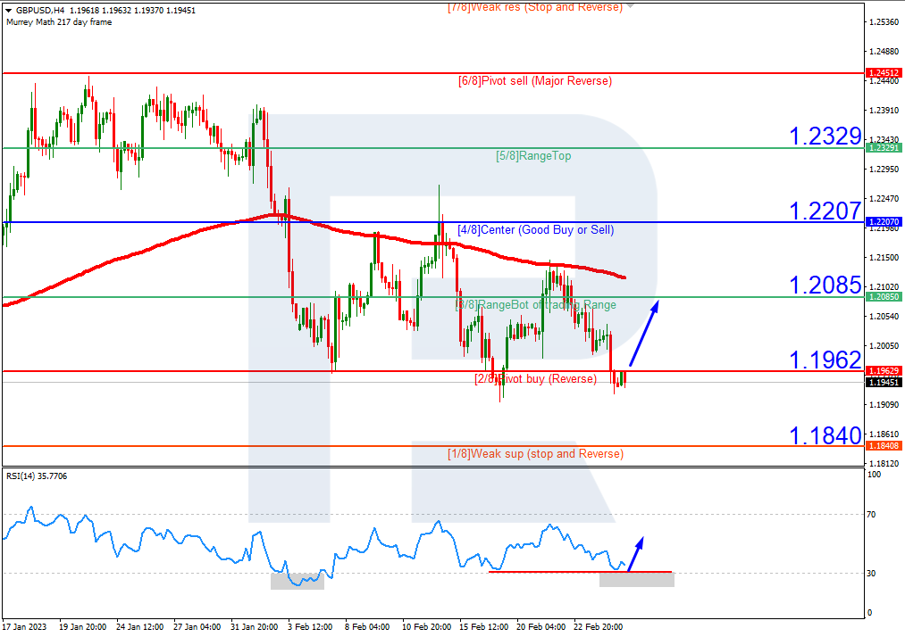 在4小时图上,情况类似。汇价低于200日均缐,表明维持下行趋势。 RSI触及超卖区域。汇价料上涨突破2/8 (1.1962),然后上涨至3/8 (1.2085)的阻力水平。若进一步跌至1/8 (1.1840)的支撑水平,该情形将失效。
