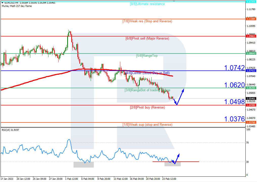 在4小时图上,欧元兑美元低于200日均缐,表明维持下行趋势。 RSI触及超卖区域,暗示可能出现调整。因此汇价料测试2/8 (1.0498),然后為自该位反弹并上涨至3/8 (1.0620)的阻力水平。若跌破2/8 (1.0498)的支撑水平,该情形将失效。在这种情况下,汇价可能将下跌至1/8 (1.0376)。