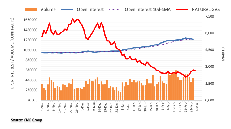 根据芝加哥商业期货交易所集团初步数据,周一天然气期货市场未平仓合约连续第二日下降,此次下降近2.2万份合约。相反,成交量增长约8.64万份合约,结束两连降。