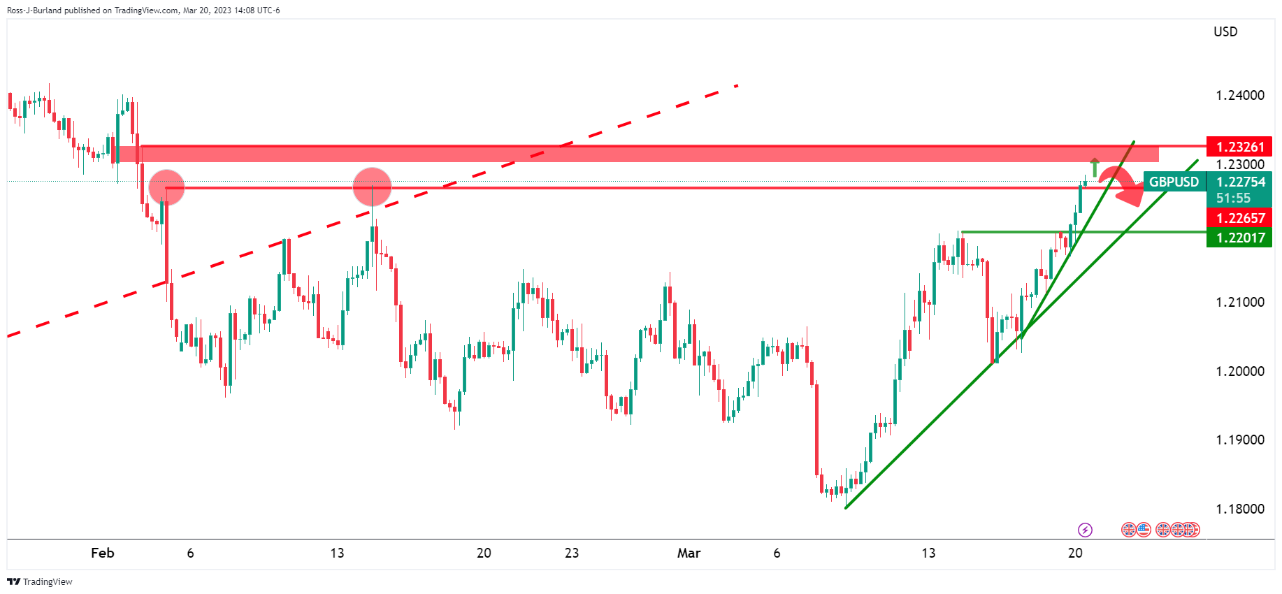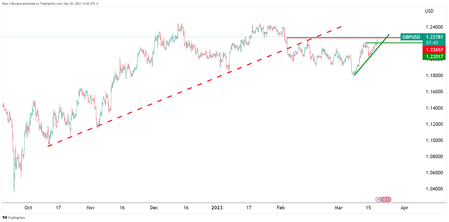 英镑/美元自2月初以来首次突破1.22,原因是全球银行业最新进展引发的避险行情有所缓解。以下分析说明英镑/美元维持看涨倾向,即便英镑/美元处在熊市。