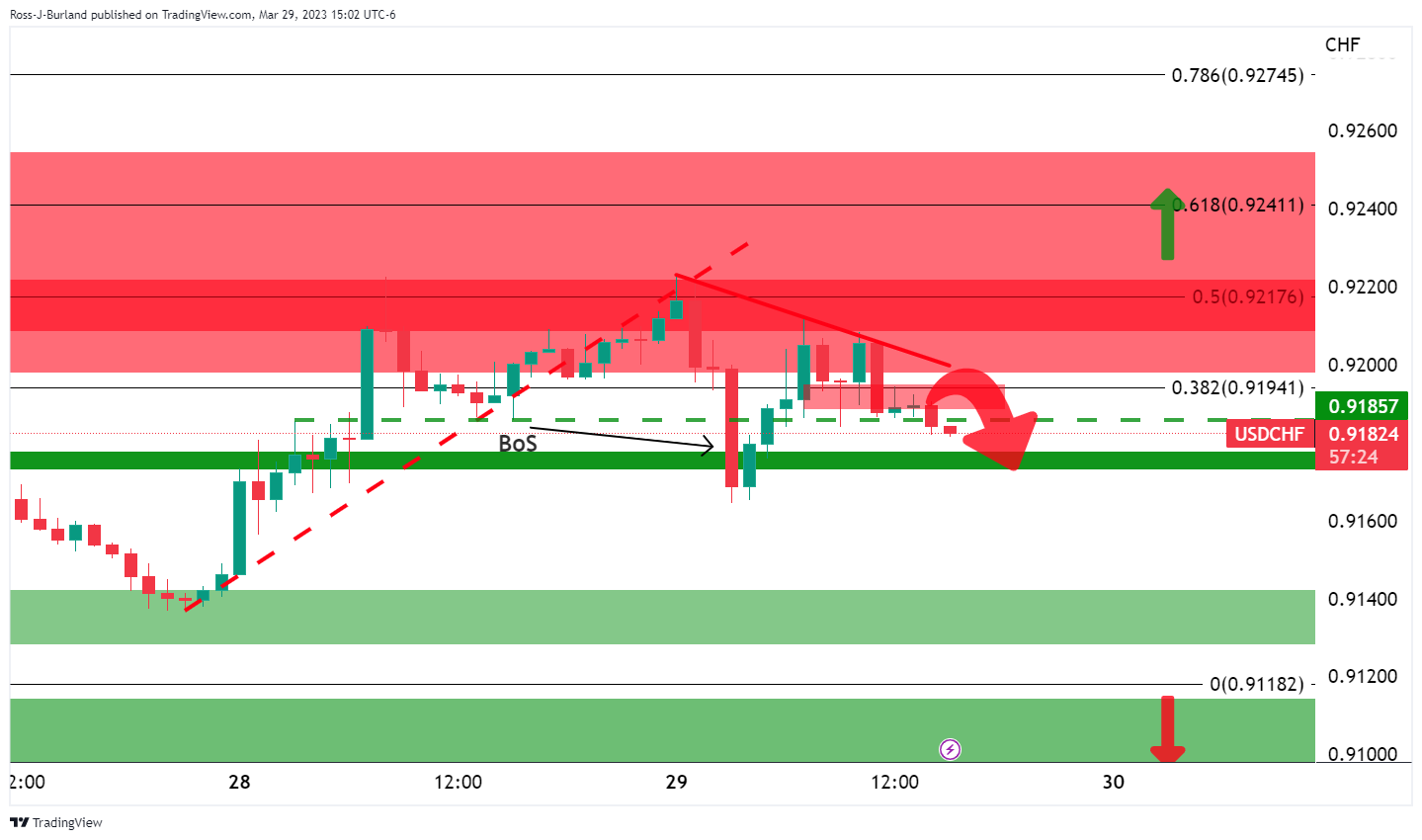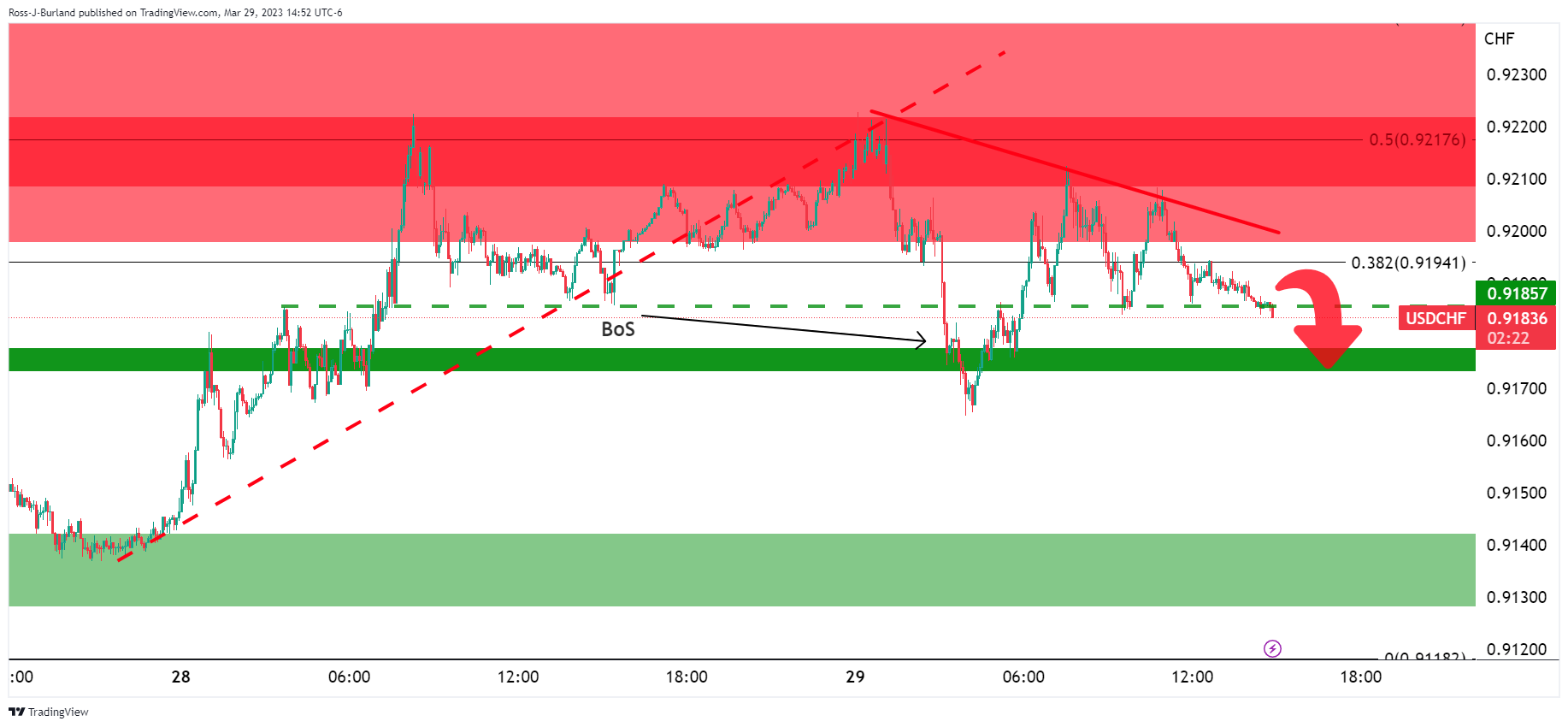 5分钟图显示,美元/瑞郎跌破肩底形态(BoS)后,再次下跌,进入看跌区域。