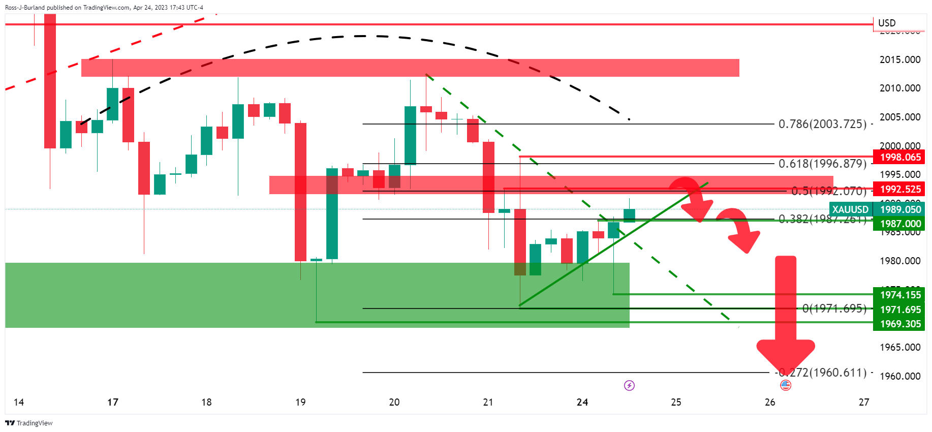 在4小时图深入分析右肩,可以发现金价已经突破小型趋势缐阻力,现在该阻力有望成為倒转趋势缐。这為金价走高进入看涨趋势带来空间,指向2000美元。然而,如果空头走强,那麽金价会接近阻力位50%均值回归区域1,992美元附近,随后自该水平下跌。
