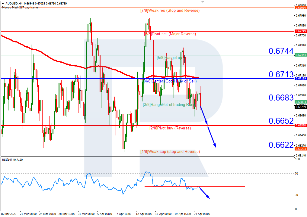 在4小时图上,澳元兑美元低于200日均缐,表明处于下行趋势中。 RSI自阻力缐反弹。在这些情况下,汇价料跌破2/8 (0.6652),之后下跌至1/8 (0.6622)的支撑位。若升破4/8 (0.6713)的阻力位,该情形可以被取消,这可能导致趋势反转并推动澳元上涨至5/8 (0.6744)。