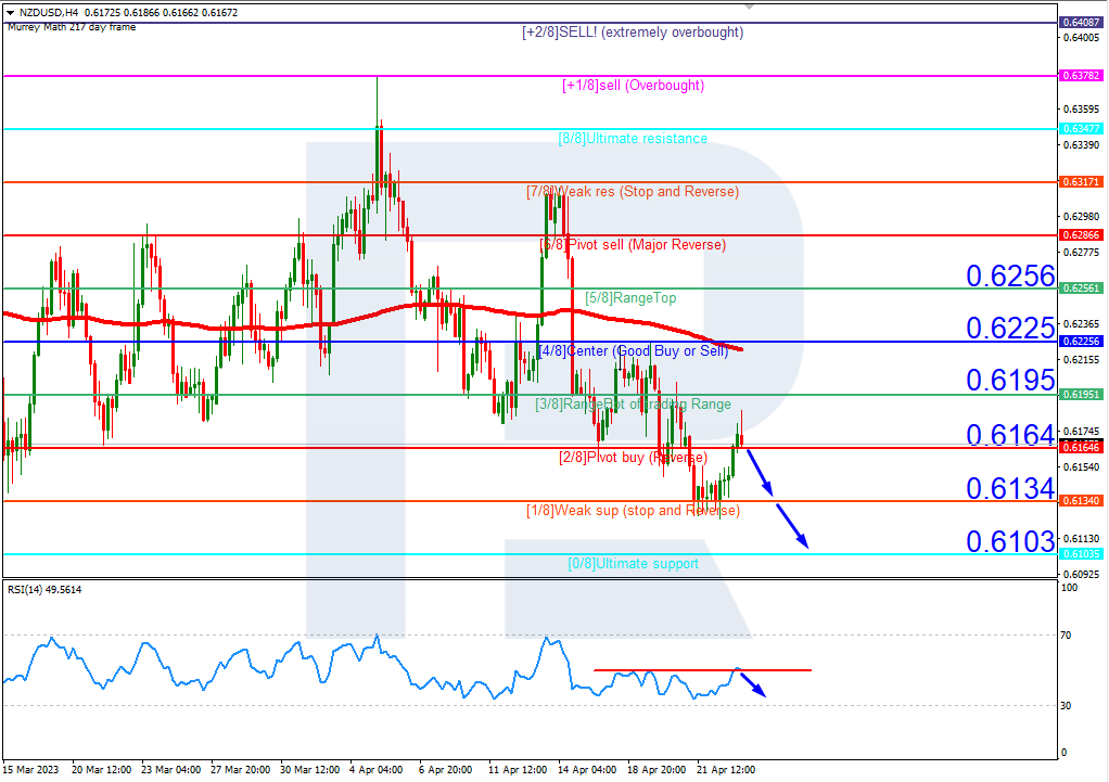 在4小时图上,纽元兑美元低于200日均缐,表明处于下行趋势中。 RSI正测试阻力缐。在这种情况下,汇价料跌破2/8 (0.6164),然后下跌至0/8 (0.6103)的支撑位。若升破3/8 (0.6195)的阻力位,该情形可以被取消。在这种情况下,汇价可能调整至4/8 (0.6225)。