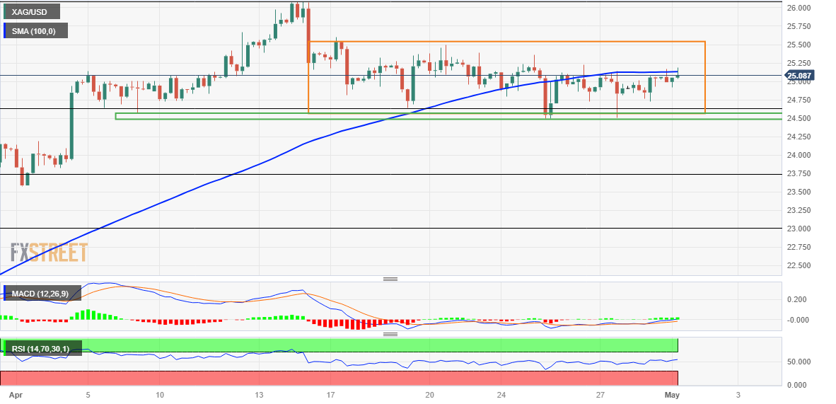 白银扭转了盘中跌至25.00美元以下的劣势,并在周一欧洲早盘时段触及三日新高,但缺乏跟进。白银一直在努力突破100周期简单移动均缐(SMA),在定位為延长最近从24.50-24.40美元水平支撑的反弹之前,值得看涨的交易员谨慎对待。