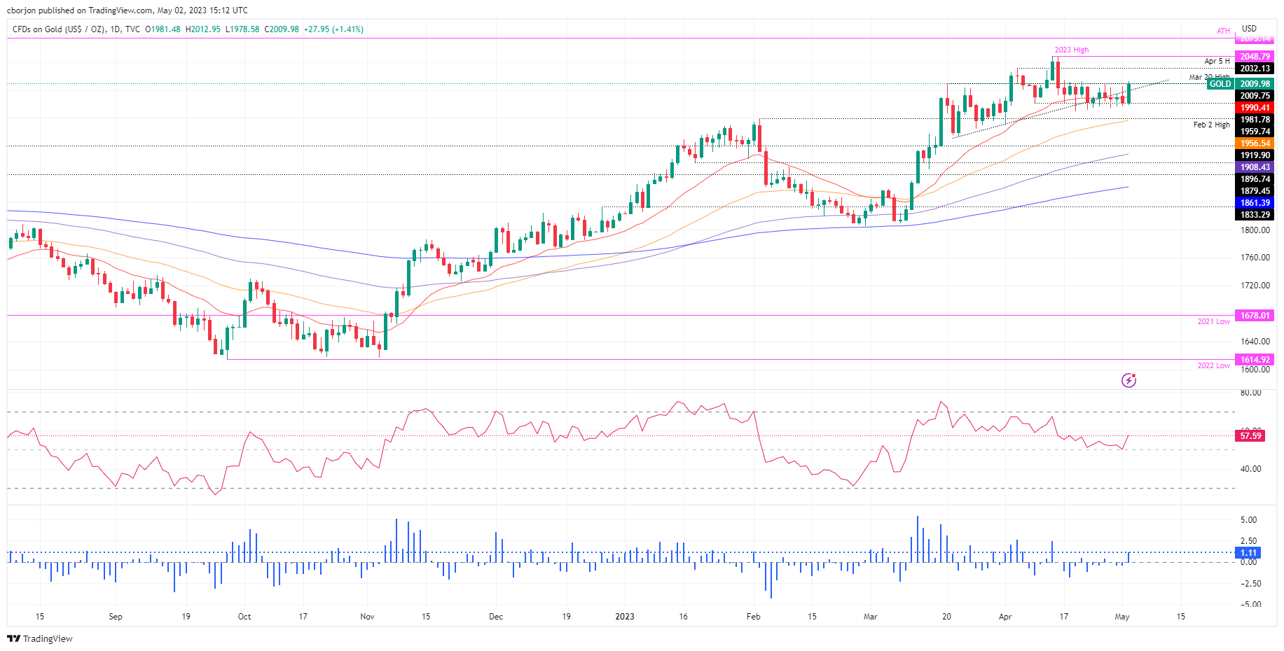 由于美国银行业危机的困扰,黄金价格突破了阻力位2000美元关口,而市场参与者正在等待美联储利率决议。在触及1978.58美元的日低点后,黄金/美元交投于2008.52美元,涨幅超过1%。
