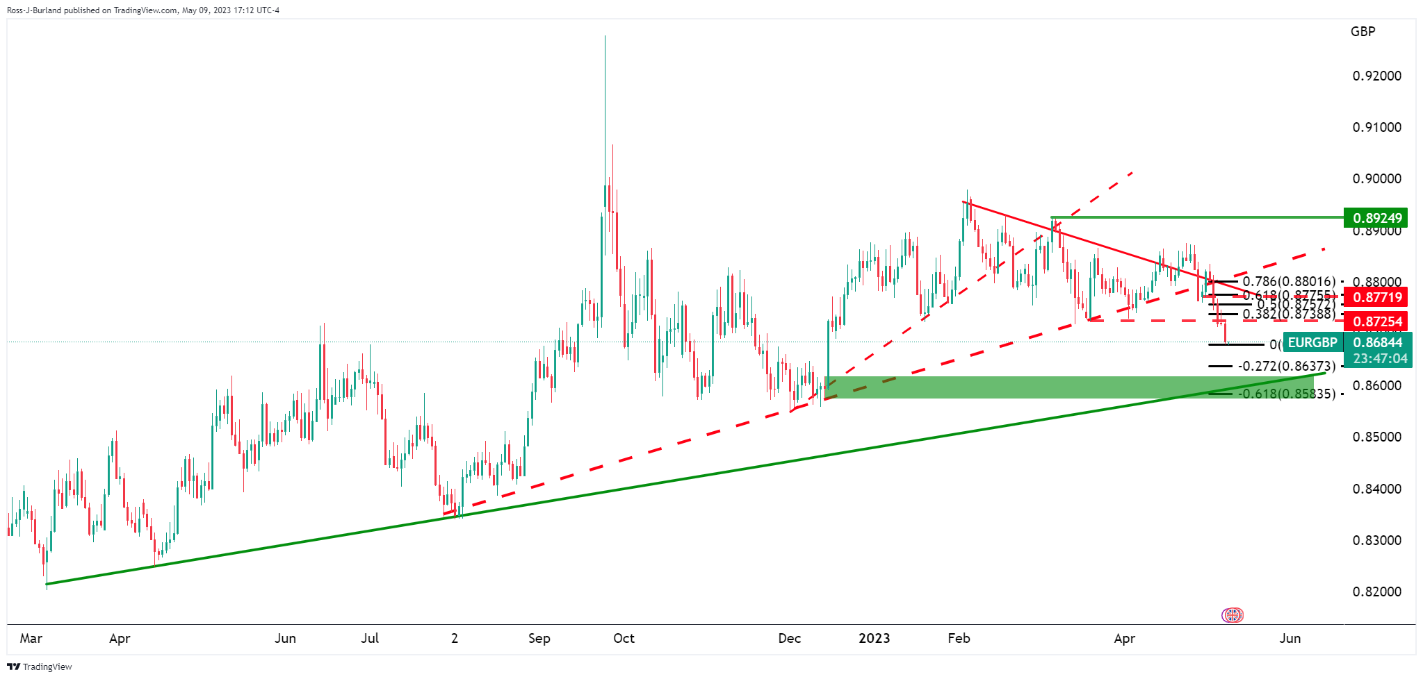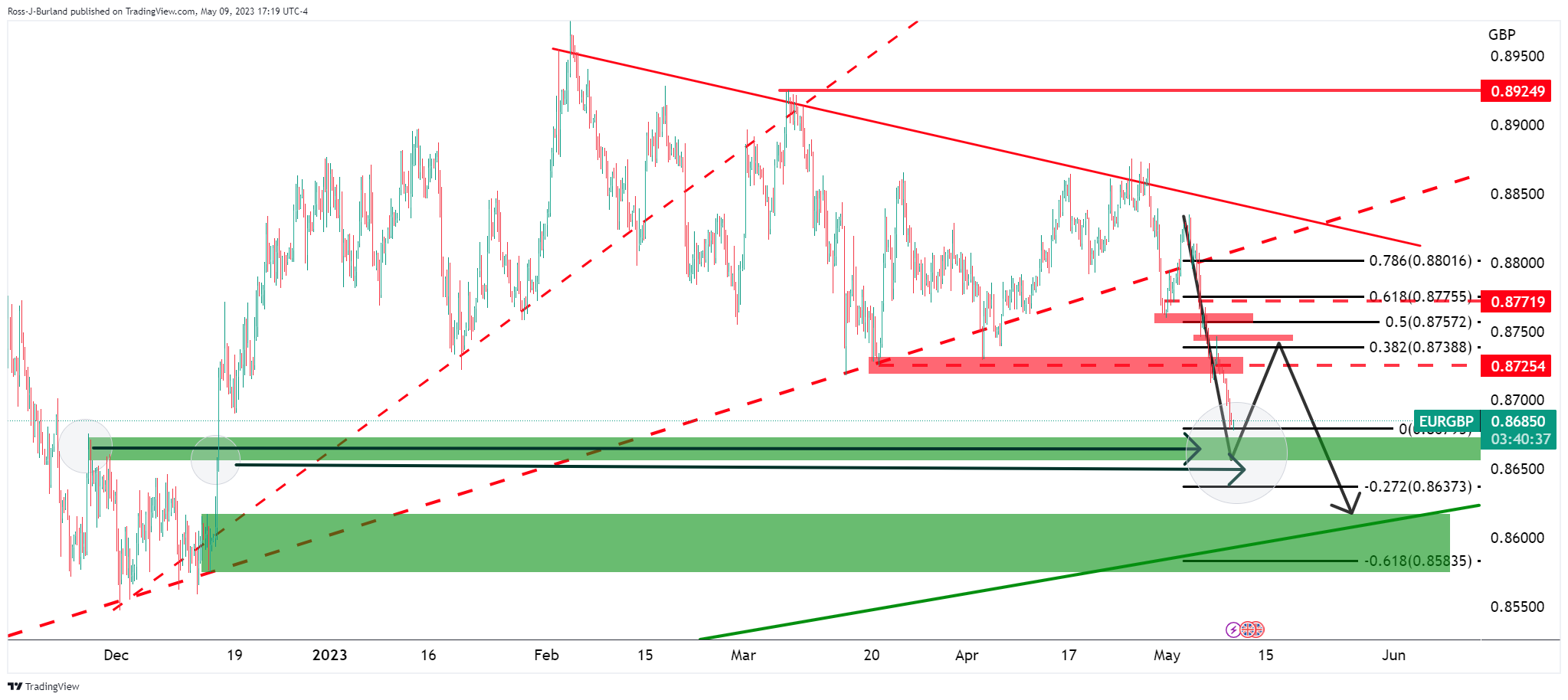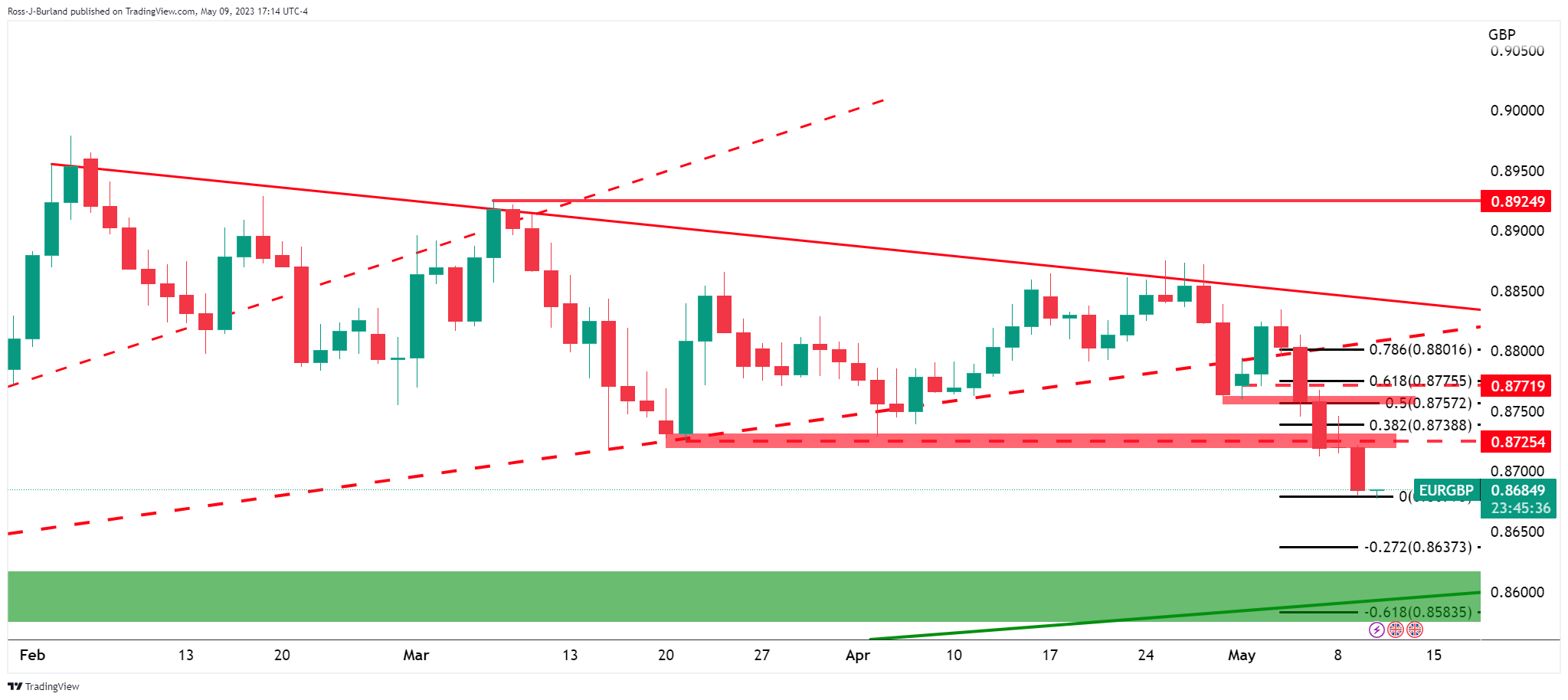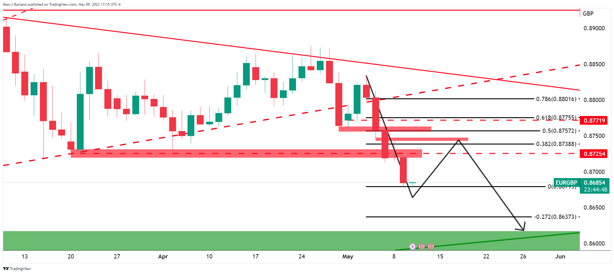 欧元/英镑自由落体式跌至看跌周期中的新低。空头正接近0.8670,指向0.8650。以下说明日图和4小时图欧元/英镑的价格走势和市场形态,并提出价格减速跌至支撑的理由。在这种情况下,在进一步接近关键长期趋势缐支撑区域之前,将有可能出现整理。