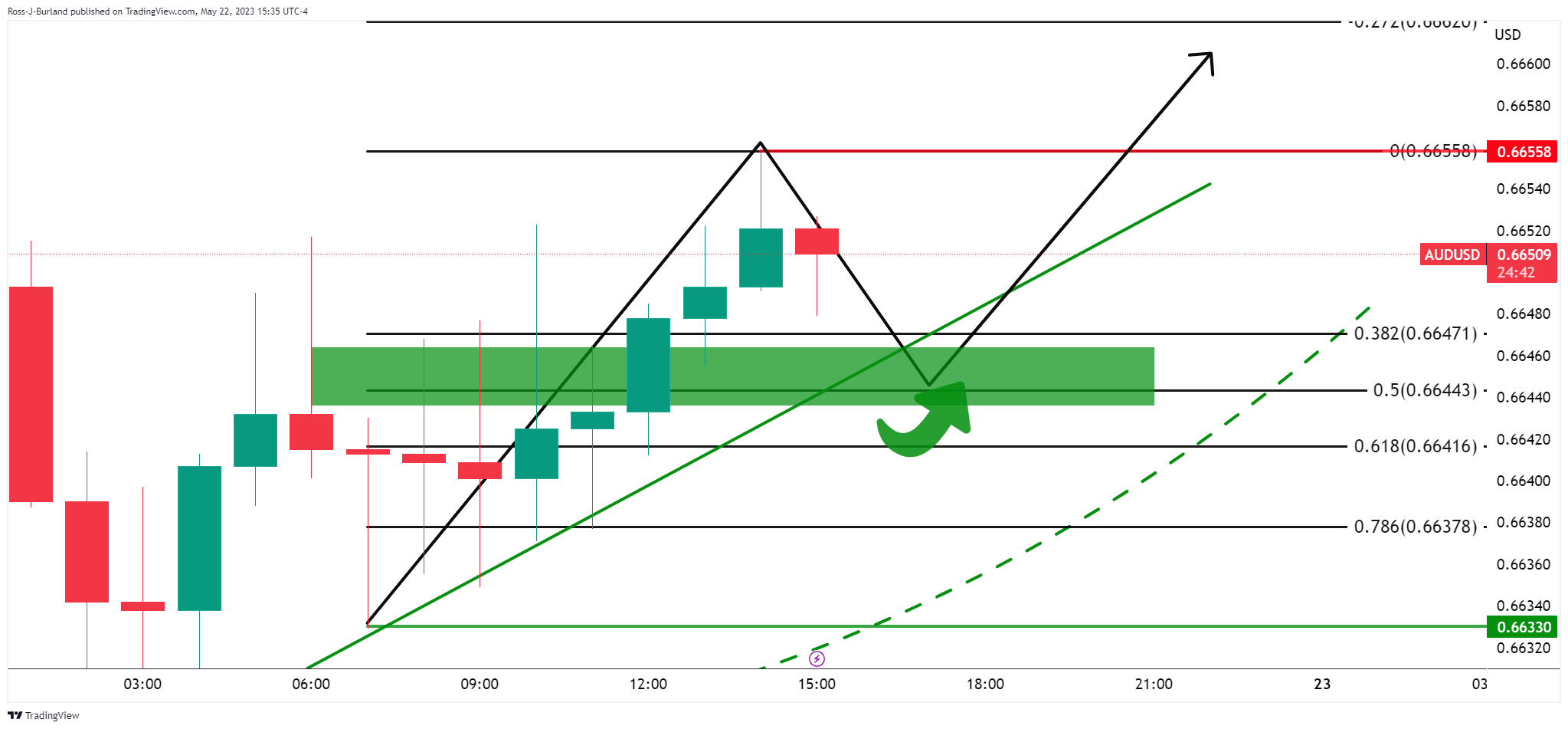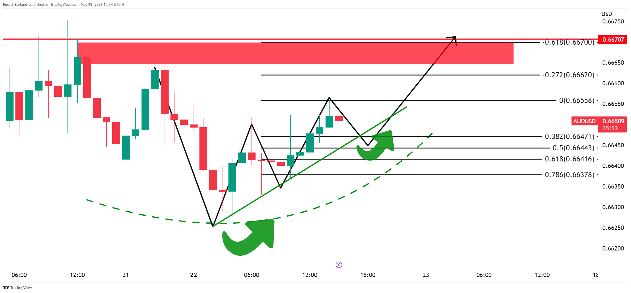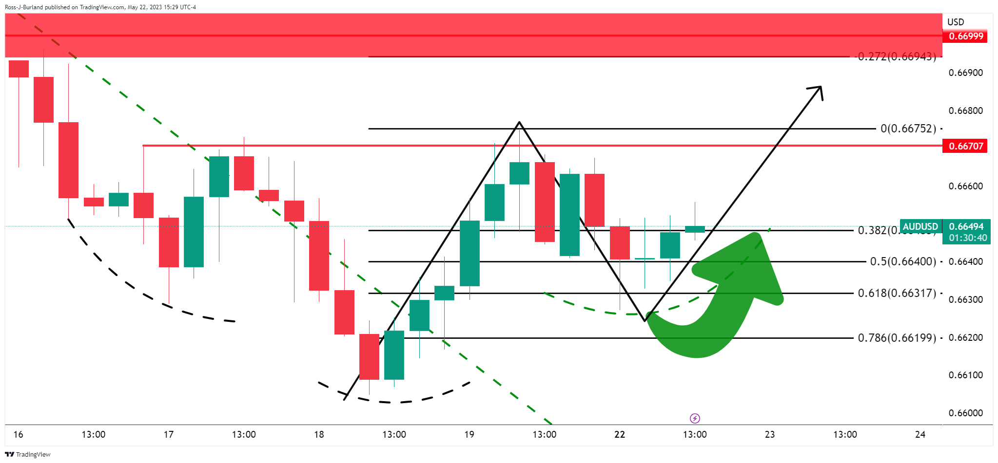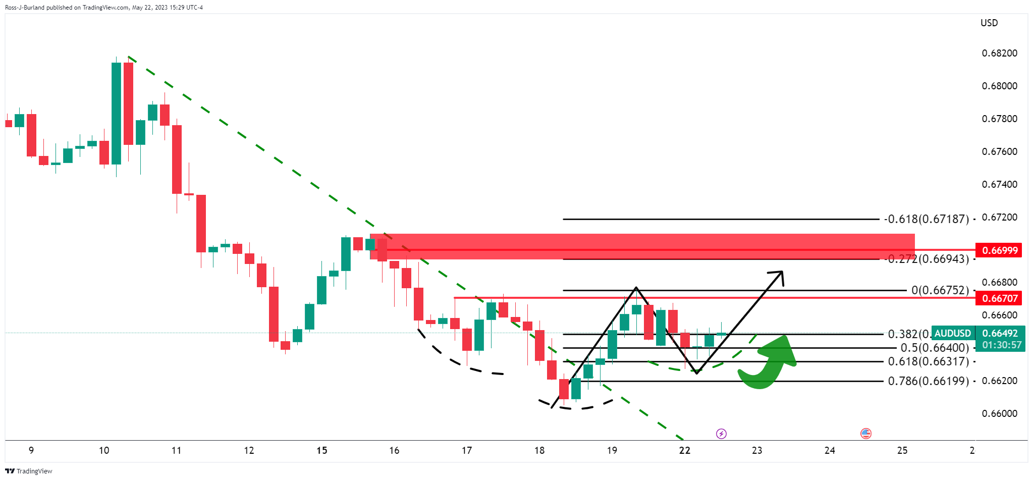 继上周五美联储主席鲍威尔发布鸽派讲话后澳元/美元获得提振。美联储主席鲍威尔倾向于在6月份暂停利率政策不变,盖过其他美联储地区主席的鹰派言论。正如以下技术分析所显示的那样,这使得澳元/美元最新整理走高: