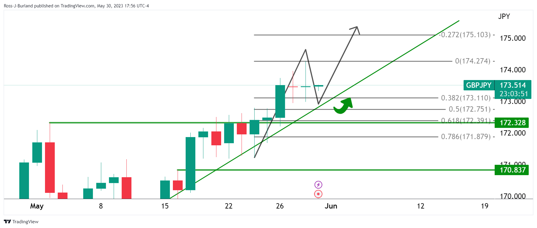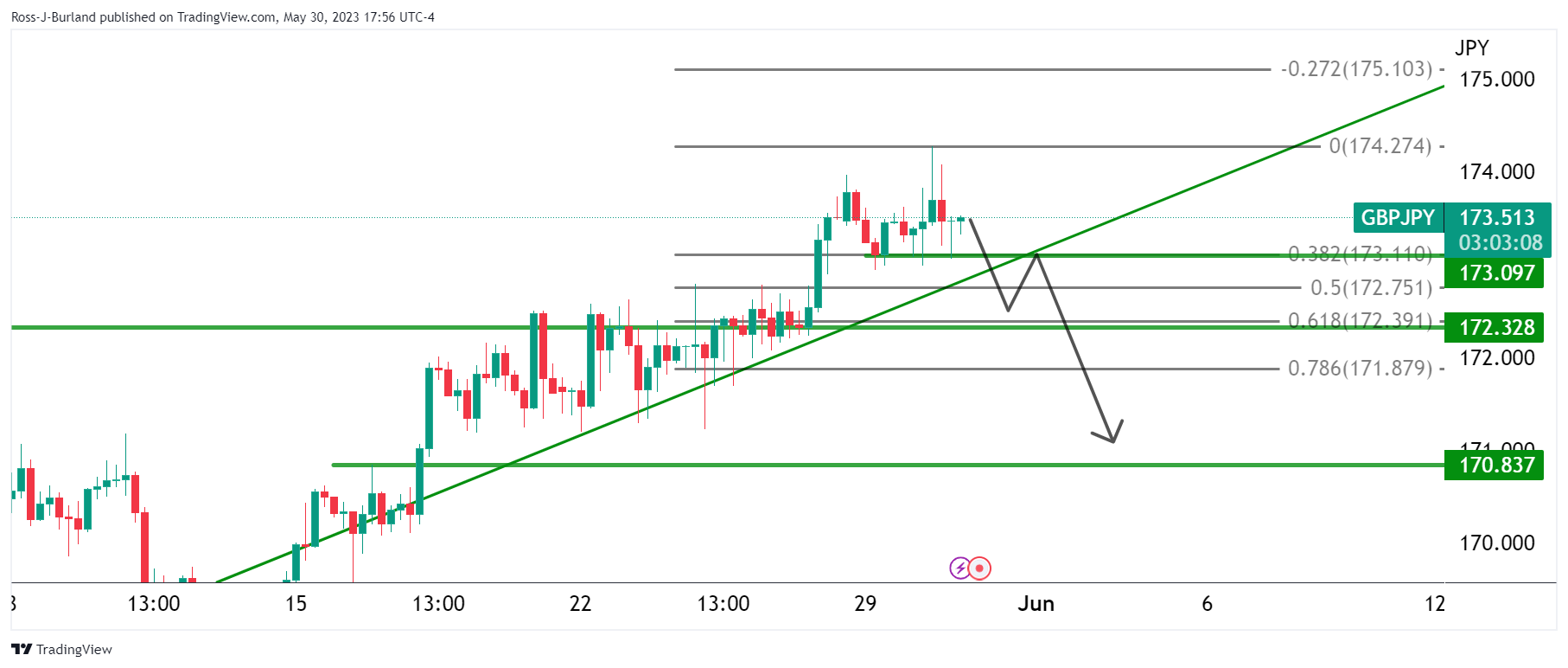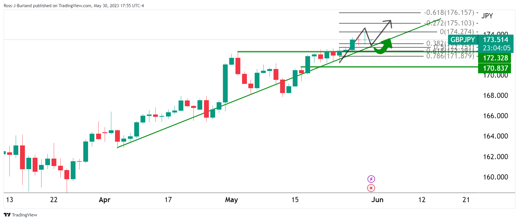 英镑/日元正测试看涨周期新高174.00附近测试,但这可能是见顶水平。英镑/日元正实现本周初步平衡,可能存在看跌头寸。以下将从看跌和看涨分析英镑/日元形态。