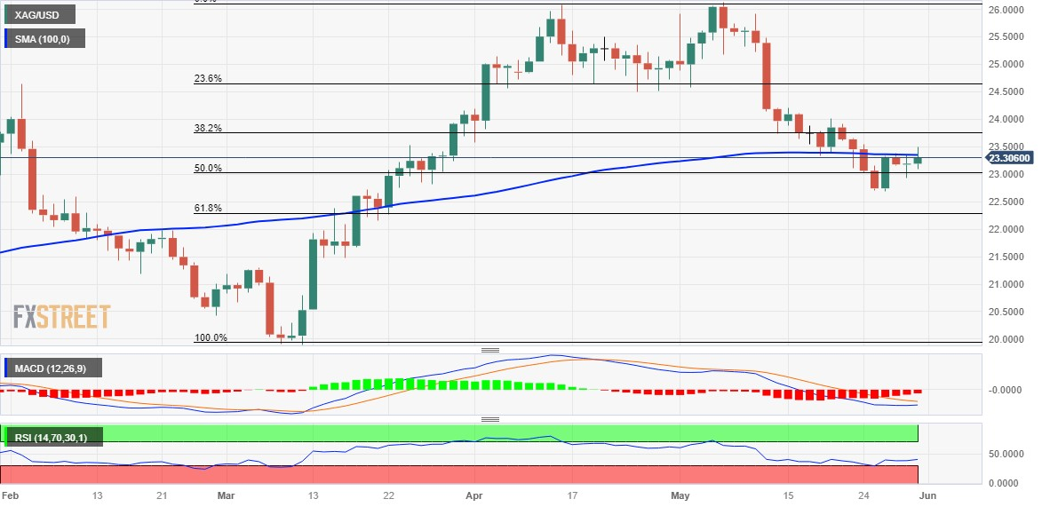 继前一天的双向价格波动后,银价吸引了新的𧹒盘,周三攀升至一周高位,约為23.50美元。然而,在北美早盘,银价难以延续这一走势或在100日简单移动平均缐(SMA)上方被认可,并回落至23.30美元区域。