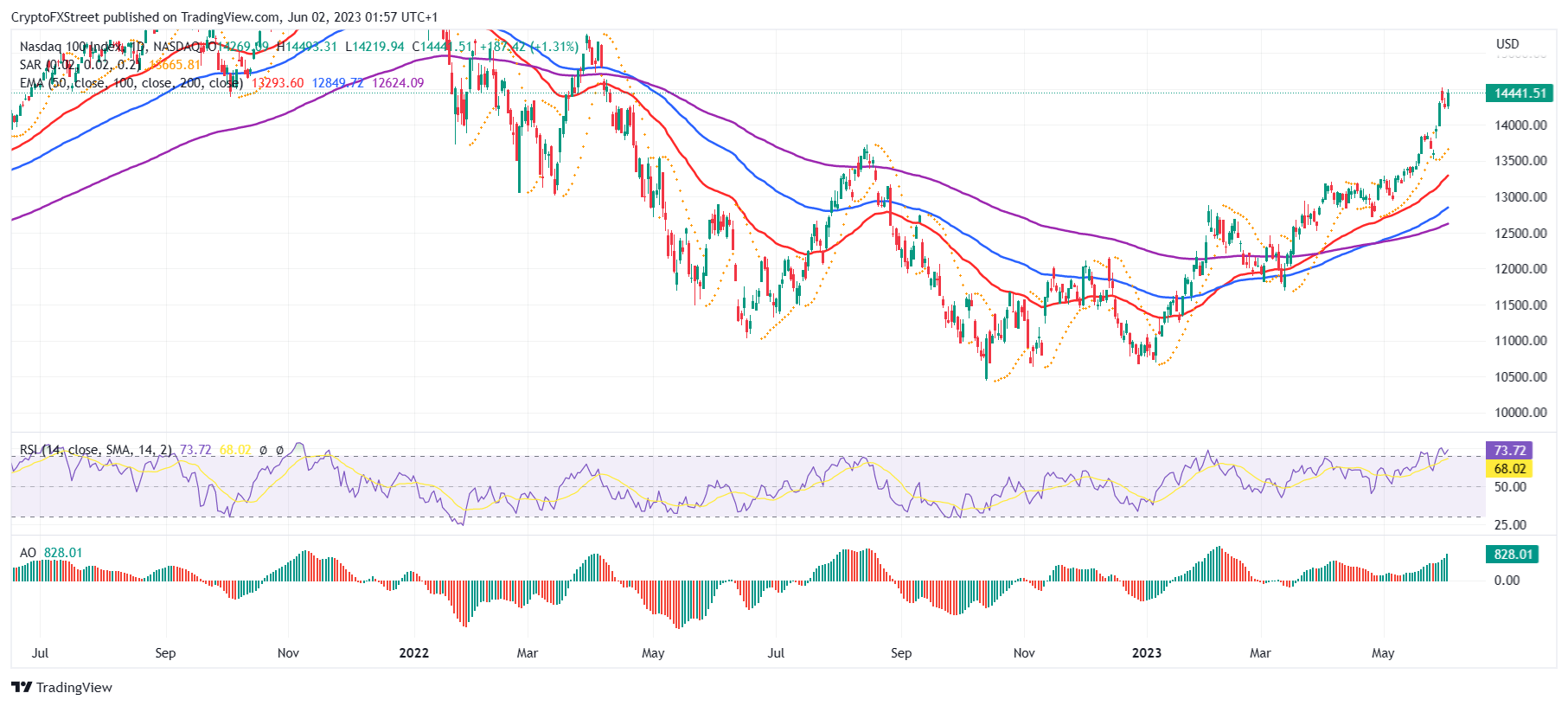 与此同时,纳斯达克指数达到了过去13个月来的最高点。上一次NDX收于14,441点大关是在2022年4月。因此,侭管比特币在图表上不断下滑,但股市指数却成功地创下了短期纪录。