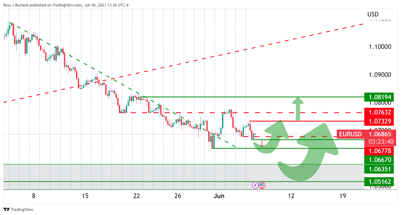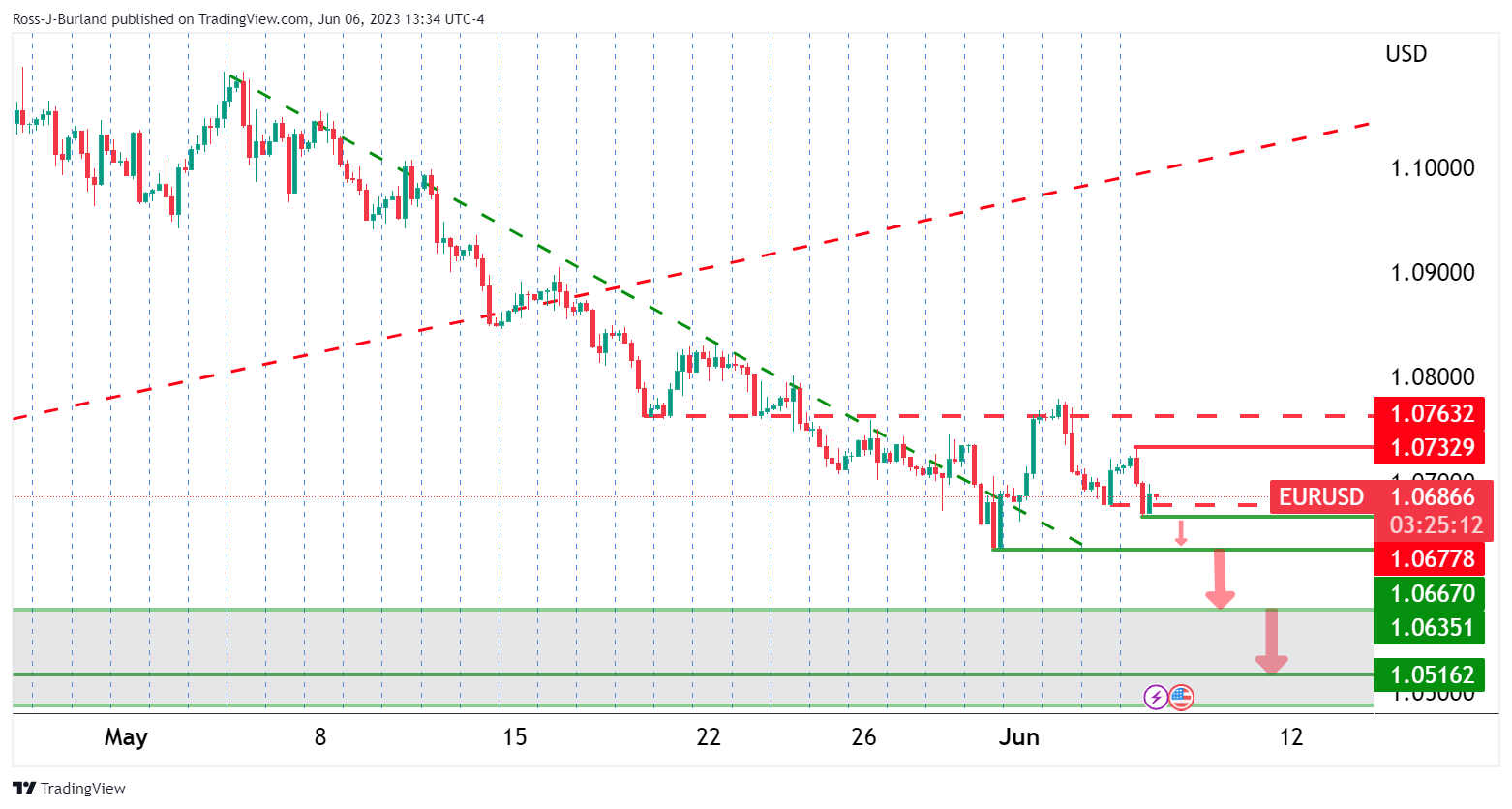 欧元/美元当日下跌,发稿时下跌约0.27%,迄今穿梭高位1.0732和低位1.0667区间。