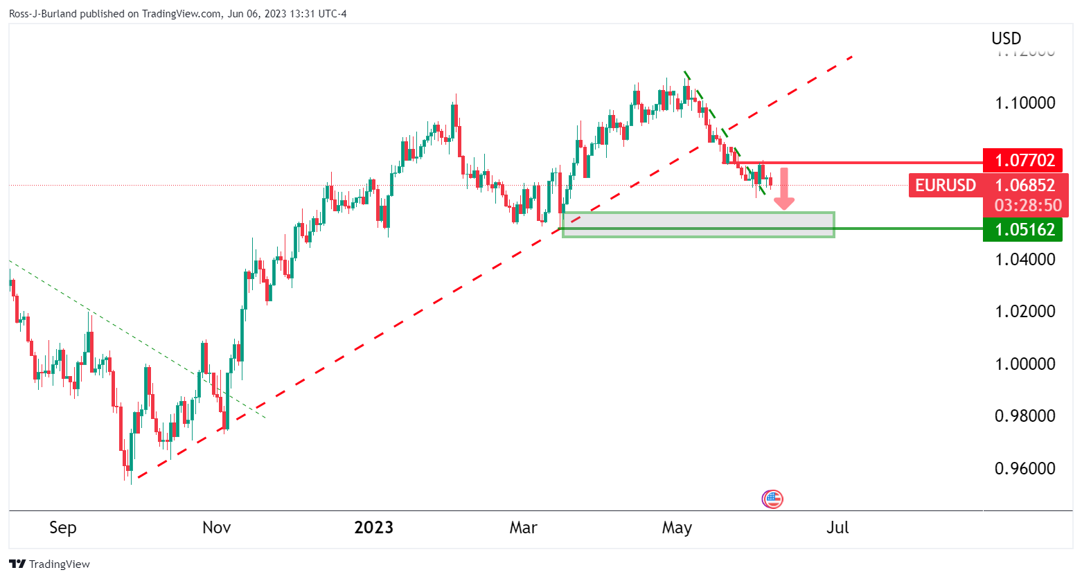 欧元/美元同样承压于水平阻力,即便目前正脱离看跌趋势,处在下跌整理当中。