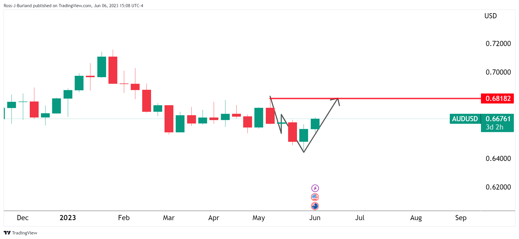 继澳储行加息后,澳元/美元已经反弹至5月中旬以来的最高水平。现金利率目前处于11年来的高位,為4.1%。这使得澳元/美元技术前景看涨,但同时也存在著整理风险,如下图所示。如果要进一步上升,主要的催化剂将来自6月14日的美联储利率决议和结果。若美联储释放鸽派倾向预计将支持澳元/美元多头寻求走高。