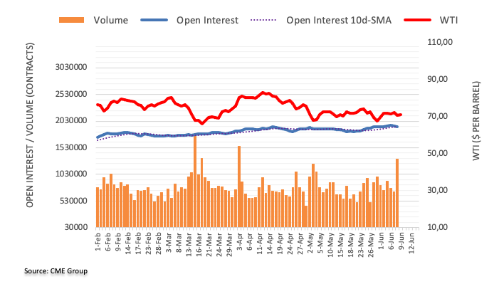 周四WTI原油价格大跌,同时未平仓合约萎缩,移除了油价在短期内进一步下跌的强度。与此同时,油价进一步反弹料在月度高点75美元关口(6月5日)遇到下一个阻力位。